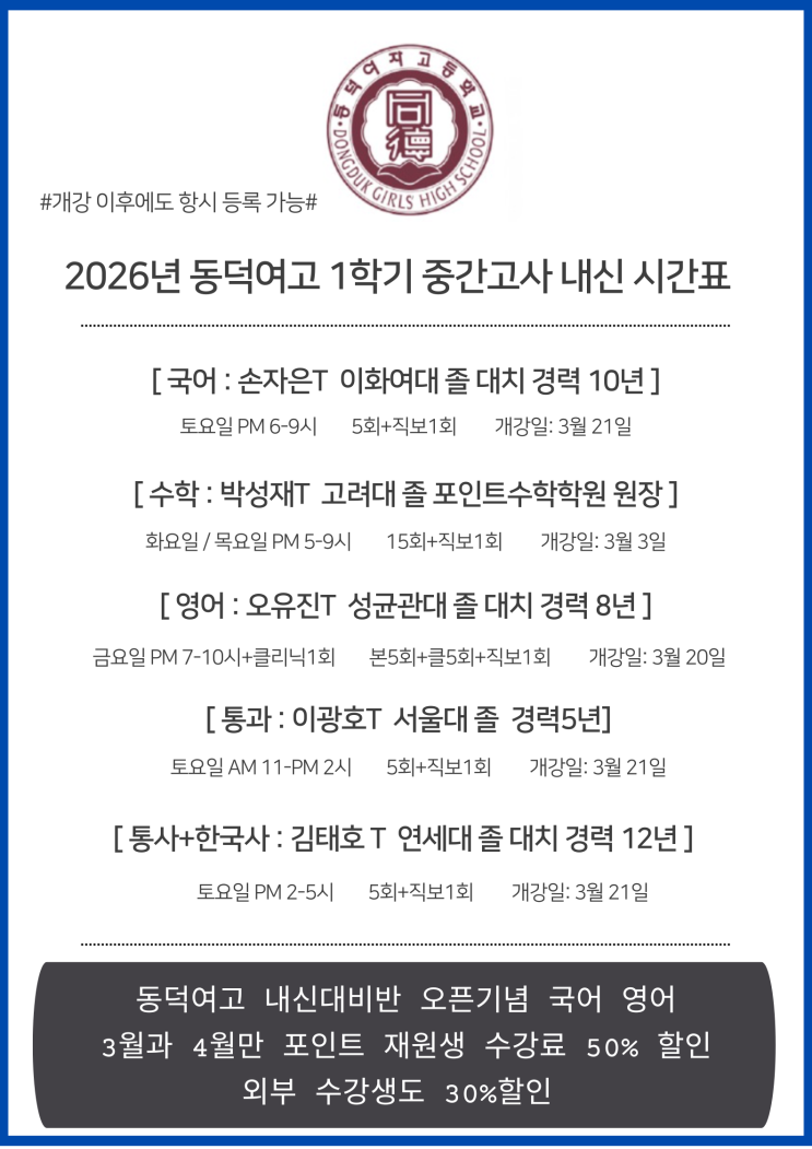 포인트S에서 야심차게 동덕여고 1학년 내신대비 수업을 준비했습니다. 내신대비 수업 오픈 기념으로 저희 학원에서는 국어와 영어 두 과목을 3월과 4월에만 포인트 재학생들은 50% 할인을 해드립니다. 외부 학생들도 3월과 4월에만 30% 할인을 해드립니다. 저희 포인트S 내신대비 수업은 강의+클리닉으로 구성되고 특히 강의식 다른 학원과는 달리 아이들 개별 밀착관리가 가장 큰 강점입니다. 그래서 정원은 10명이내입니다. 아이들별로 부족한 부분을 따로 따로 챙겨주고 아이들이 자신들의 실력에서 최선의 결과를 얻을 수 있도록 이끌어줍니다. 그리고 가장 중요한 것 실력은 당연하고 아이들을 아끼고 사랑하는 마음 따뜻한 선생님들로 모셨....... <img src="https://blogthumb.pstatic.net/MjAyNjAyMjZfMjE3/MDAxNzcyMTA5NjgzNTk5.x6EKnkWpqk-etHC_aibEn--x_eMBZlqxmh-JljaeDhUg.j1-QSkQVRR6sNIK94ylL_pjiAqMuqfMj-XFdBzVDo_8g.PNG/2026_%B5%BF%B4%F6%BF%A9%B0%ED_%B3%BB%BD%C5%BC%F6%BE%F7_%BE%C8%B3%BB.png?type=s3" />
