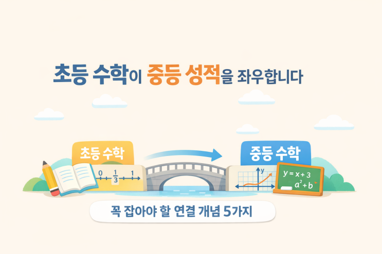 중학교에 올라가서 수학이 갑자기 어려워졌다고 느끼는 경우가 많아요. 그런데 실제로는 “중등 내용이 어려워서”라기보다, 초등에서 배운 핵심 개념이 연결되지 않은 채로 넘어간 경우가 훨씬 많습니다. 중등 수학은 새로운 걸 무작정 많이 배우는 과목이 아니라, 초등에서 배운 개념을 ‘문자’와 ‘식’으로 더 정확히 다루는 과목이에요. 그래서, 초등에서 아래 5개 연결 고리를 제대로 잡아두면, 중등 진입이 훨씬 부드러워집니다. 중등 수학을 결정하는 ‘연결 개념’ 5가지 1) 분수·소수 감각 → 중등의 ‘유리수’와 계산 안정감 초등에서 흔히 생기는 빈틈 분수 크기 비교를 느낌으로만 함 소수 곱셈/나눗셈에서 “왜 그런지” 없이 절....... <img src="https://blogthumb.pstatic.net/MjAyNjAzMDNfMiAg/MDAxNzcyNTIxNTYyMzkz.3JjhiylF79g7jqvesMheCqoIF-lE0MbFsYULYa1u17Eg.3P1Ck4ZhamUw4tX-orVdoFLue0rbGMv1BXhe5E2MnL0g.PNG/%BC%F6%C7%D0%C0%C7%C8%E5%B8%A701.png?type=s3" />