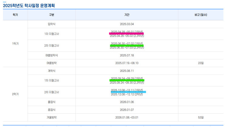 별내동 중고등학교 학사일정