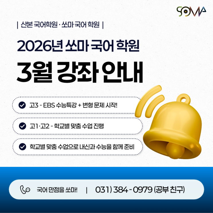안녕하세요. 국어 만점을 위한 산본 국어학원! 쏘마 국어 학원입니다. 오늘은 2026년 3월 쏘마 국어 강좌의 내용을 전해드리려고 합니다! 이번 3월은 새 학기의 시작과 함께, 내신과 수능 준비의 기초를 탄탄히 다질 수 있는 매우 중요한 시기입니다. 3학년 - EBS 수능특강 + 변형 문제 시작! 고3 금요일 오후 6시 ~ 9시 고3 토요일 오후 12시 ~ 3시 고3 일요일 오후 6시 ~ 9시 (모두 마감 직전) 3학년들은 EBS 수능특강을 꼼꼼하게 공부하는 것이 필수입니다. 따라서 내신 교과서가 별도로 없고 모든 학교가 EBS 수능 특강으로 내신을 진행합니다. 쏘마 국어 학원은 수능 50% 연계율로 EBS의 영향력 매우 높은 점을 고려해 | 전 작품....... <img src="https://blogthumb.pstatic.net/MjAyNjAzMTFfMTkg/MDAxNzczMTg0ODM2ODc3.pNAyU8Mz2m3NJTzOHGz0MF02hs1mMhlUf8f0e8WbAzEg._mKzmeiGI3fKdDX2x2O2H4RTfkS3plwMh3HAz8NUQdQg.PNG/%BB%EA%BA%BB_%B1%B9%BE%EE%C7%D0%BF%F8-001_%281%29.png?type=s3" />