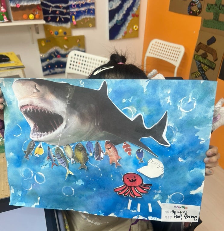 <작은 물고기를 구해주세요!> 주니어 하트 프로그램 상어의 상징적 의미는 아이들마다 모두 다릅니다. 상징을 명확히 인지하는 아이들도 있지만, 인지하지 못한 채 표현에 머무르는 경우도 있죠. 그러나, 괜찮아요. 억지로 인지하도록 유도하지 않아도 아이들은 무의식 속에 이미지를 표현하고 내재화 합니다. 아이들은 주로 작은 물고기에 자신을 투사합니다. 많은 물고기 중 하나가 ‘나' 일수도 있고, 저 작은 물고기 모두가 '자아'로 표현되는 것일 수도 있어요. 어떤 아이는 작은 물고기 하나하나에 자신 내면의 어떤 추상적인 것들로 이해하기도 했어. 가령…사랑, 지혜, 용기 등등등 또는, 또다른 존재를 등장시키기....... <img src="https://blogthumb.pstatic.net/MjAyNjAyMjVfMTA5/MDAxNzcxOTQ5NzI2MzEw.9LChfBxRfP_s9PKeSMpPRjCT5m-OkD0vN6S-vr4rIzkg.s1iWO86rsGJ_lqyvOtNGqysq0p3tWCCOuJQHJf7b780g.JPEG/output%A3%DF711508431.jpg?type=s3" />