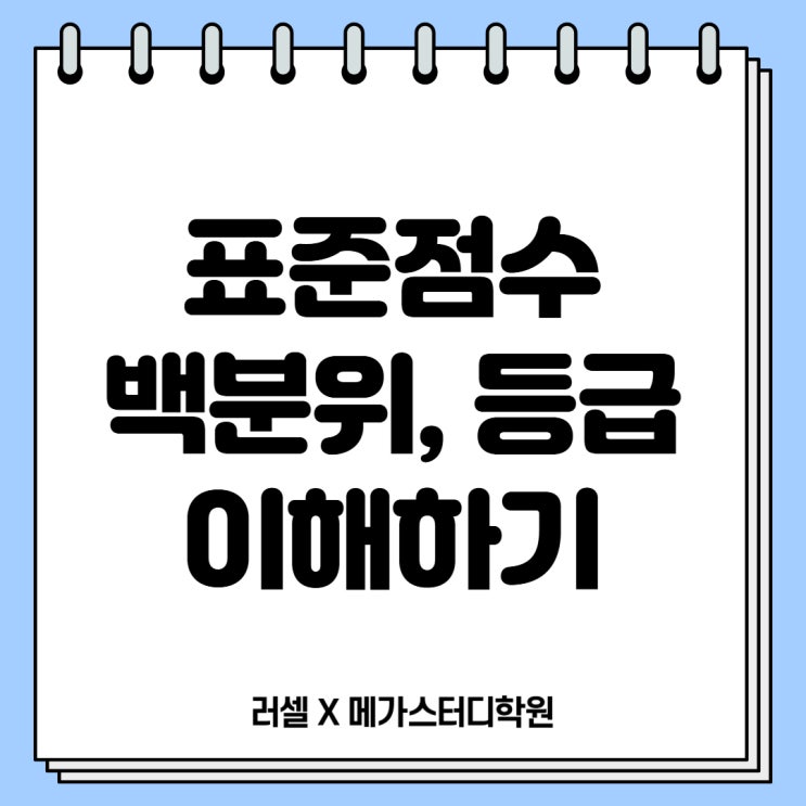 안녕하세요. 러셀X메가스터디학원입니다. 입시를 준비하는 학생들이라면 기본적으로 알아야 할 표준점수, 백분위, 등급에 대해 준비했는데요, 함께 알아볼까요? 표준점수 시험 난이도와 전체 응시자의 점수 분포를 반영해 나의 상대적 위치를 객관적으로 파악할 수 있도록 변환한 점수인데요. 같은 원점수라도 난이도와 응시 집단에 따라 표준점수가 달라질 수 있고 시험이 어려워 평균이 낮아질수록, 높은 점수의 학생 표준점수는 높아집니다. 시험이 쉬우면 응시자 간의 표준점수 차이가 전반적으로 줄어듭니다. 따라서, 어려운 시험일수록 표준점수의 가치가 커집니다. 백분위 백분위는 나보다 낮은 점수를 받은 학생의 비율을 나타내는 점수....... <img src="https://blogthumb.pstatic.net/MjAyNjAzMjBfODAg/MDAxNzczOTczNzYyMjQ4.ORCnJsAkgejrpDXlhDdPvyTRHwZQTqc_rWxBif1CDDsg._j0Ksd5qXCIFAnzIfciCkO6VQliWwF_Q8QYF9urkcegg.JPEG/%C1%A4%BA%B8%BC%BA_%BA%ED%B7%CE%B1%D7_%BD%E6%B3%D7%C0%CF_%282%29.jpg?type=s3" />
