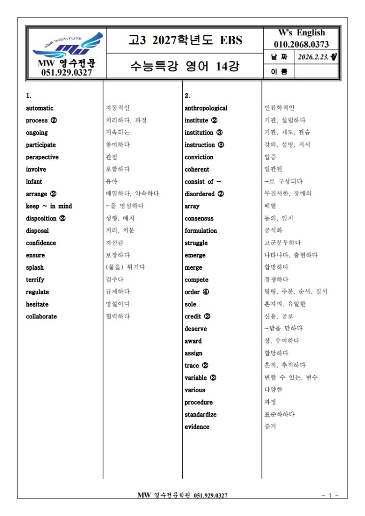 명륜동 영어 MW 고3 2027학년도 EBS 수능특강 영어 14강,15강 필수단어