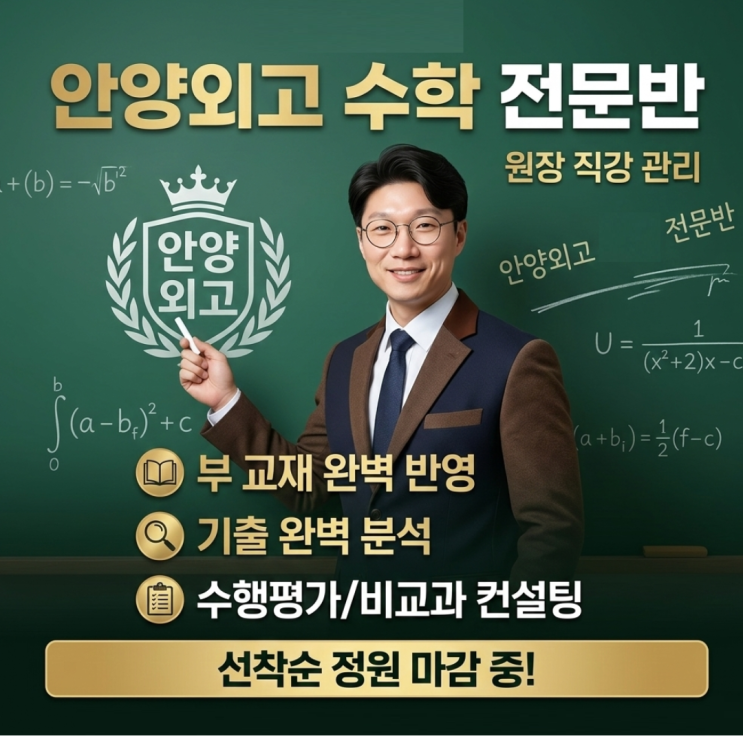 평촌 학원가에서 15년 안양외고 학생들의 치열한 고민을 함께해 온 평촌수학학원 현수학 학원 원장 평촌입시김쌤입니다. 안양외고 학생들에게 수학은 단순한 과목 그 이상의 의미를 가지고 있습니다. 문과 성향이 강한 학교 특성상 수학에서 우위를 점하는 것이 곧 전체 내신 등급의 '결정타'가 되기 때문입니다. 오늘, 안양외고 학생들의 수학 성적을 확실히 책임질 [안양외고 특별 전문반] 개강 소식을 전해드립니다. 안양외고 맞춤형 커리큘럼 부교재와 교과서 완전 분석 안양외고 내신의 핵심은 무엇일까요? 바로 높은 부교재 출제 비중입니다. 시중 유형서만 풀어서는 절대 고득점을 받을 수 없습니다. 평촌 현수학은 안양외고의....... <img src="https://blogthumb.pstatic.net/MjAyNjAzMDZfMTU0/MDAxNzcyNzc5MjMxODAw.YprMfuvzqy8mJxbVQAhKDTXYvHjINRNbx03RDY3lNU4g.-X3lVz4nnRUDXoGULlK1hnzQ0U9NUco1gOwlSBqnw_Eg.PNG/%BE%C8%BE%E7%BF%DC%B0%ED_%BC%F6%C7%D0_%C6%AF%BA%B0%B9%DD.png?type=s3" />