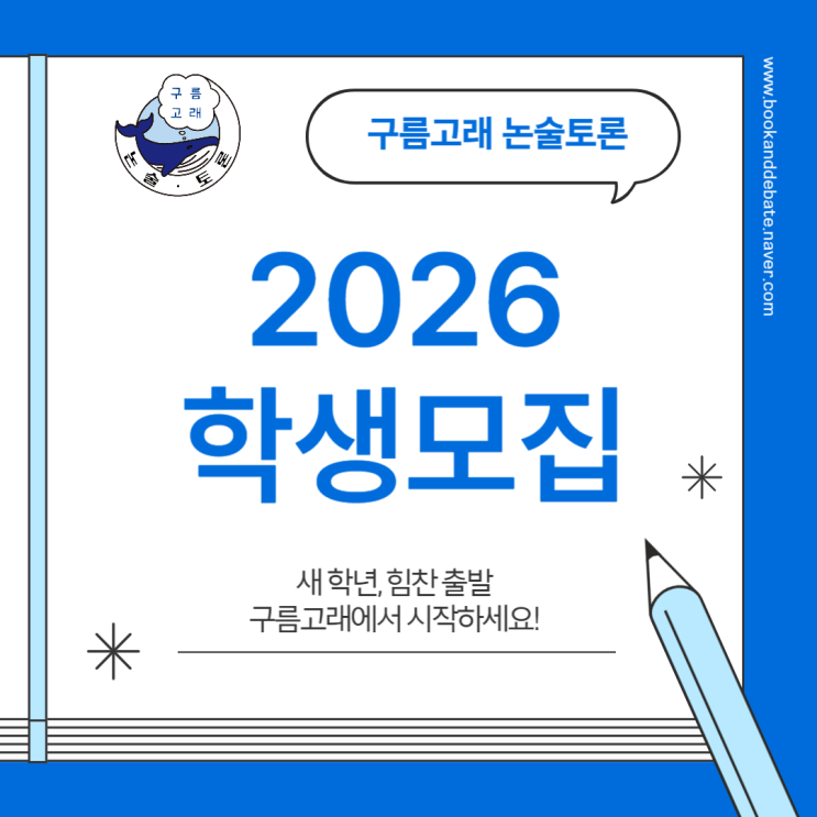 안녕하세요, 구름고래_논술토론입니다. 추운 겨울이 지나고 봄이 성큼 다가왔습니다. 2026년, 설레는 마음으로 새 학기를 기다리는 시간입니다. 새 학년, 새 학기를 맞아 구름고래와 함께 수업 할 학생들을 모집합니다. AI 시대에 문해력과 어휘력을 걱정하는 부모님, 자신감 있는 발표를 하고 싶은 학생들, 지필 고사 확대로 글쓰기에 자신 없는 중학생들, 책 읽기로 배경지식을 넓히고 싶은 초등, 중등학생들 모두에게 꼭 필요한 구름고래_수업을 안내합니다. 구름고래 논술토론에서는 첫 번째, 구름고래 수업하는 책을 빌려드립니다. 작년부터 부모님들께서 책을 준비하는 번거로움 없이 구름고래가 준비했습니다! 책 대여 --> 독서 -->....... <img src="https://blogthumb.pstatic.net/MjAyNjAyMjRfMjE0/MDAxNzcxOTE0MjI3MzU4.mgTWc68tGd7wiyAJAZd6NtvOjWTkRofDq0iTTWjMWpgg.GR6T9Ia8TSfyGAppiFo5FA7UEMvjorYtFc19OPHFDGkg.PNG/001.png?type=s3" />
