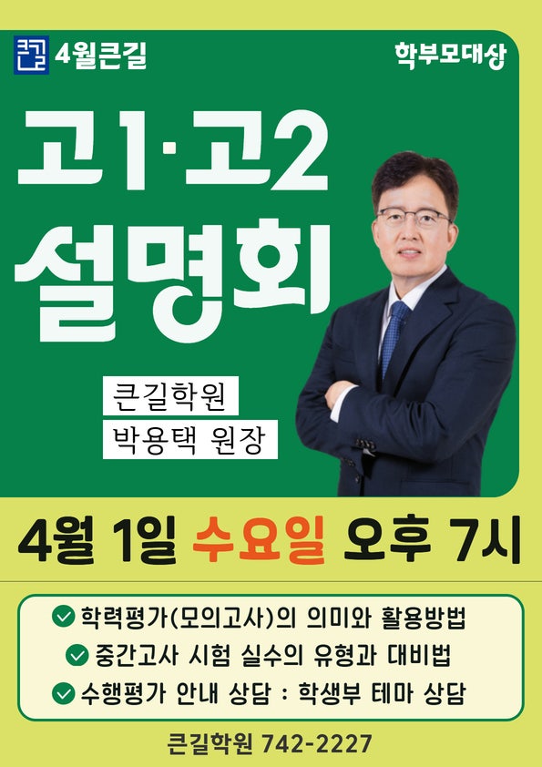 안녕하세요. 범어동 중.고등부 전문 수학 / 국어 / 과학 단과 큰길학원입니다. 3월 학력평가와 새학기 첫 중간고사를 앞두고 큰길학원 설명회를 준비했습니다. 고1.고2 학부모 대상 설명회 ⬇️⬇️⬇️ https://band.us/band/77553240/post/2207 1️⃣일시 4.1 수요일 오후 7시 2️⃣장소 큰길학원 [수성구 달구벌대로 2507, 10층] 3️⃣대상 고1 학부모님 고2 학부모님 4️⃣설명회 주제 ●학력평가(모의고사)의 의미와 활용방법 ●중간고사 시험 실수의 유형과 대비법 ●수행평가 안내 상담: 학생부 테마 상담 5️⃣연사 큰길학원 박용택 원장 ▶️설명회 신청◀️ https://naver.me/FbVckvTK 큰길학원 053.742.2227 <img src="https://blogthumb.pstatic.net/MjAyNjAzMTlfMTU5/MDAxNzczOTIzNTMxODcz.8qeTtDvu0bvBIvGXsaBeX55pG30NyrWxWQdtPPRS_vUg.kppypH5T2oJ8_4y6E3WcJ1a1a18zYMRa73BDoUmjUBMg.JPEG/0401_%B0%ED1%B0%ED2%BC%B3%B8%ED%C8%B8.jpg?type=s3" />