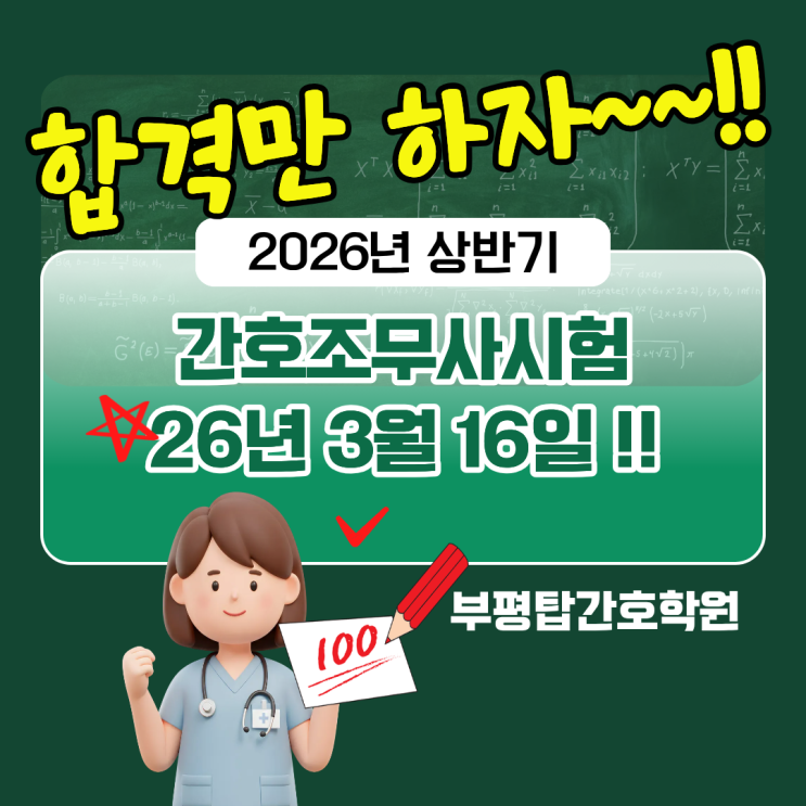 26년 상반기 간호조무사시험 응시! 인천간호학원부평탑간호학원 26년 3월 16일 오전10시 서울구로시험센타 단체응시!! 인천간호학원부평탑간호학원 26년 상반기 간호조무사시험 준비완료!! 전원 합격을 기원하며 그동안 노력의 결실을 맺는 결전의날!! 수험생여러분~ 모두 힘내세요!! 인천간호학원부평탑간호학원 26년 봄학기 정규반!! 신입생 선착순 모집중! 주4일수업!! (국비/일반) 26년 4월 10일 개강! 서두르세요~~^^ 주4일만 집중하여 국비과정을 수료하는 나의 맞춤형 부평탑간호학원의 간호조무사과정! 부평탑간호학원이 이룬 현 성과입니다!! 25년 직업능력개발 훈련생이수자평가 A등급 획득! 인천간호학원중 최초 획득! 노동부 역량평....... <img src="https://blogthumb.pstatic.net/MjAyNjAzMDNfNjIg/MDAxNzcyNTIzNTc3MDcw.D06-WfoEgF2zdD4WYcVDK7yg3ToCAmsCnpvjke7lrTYg.9MF3Ka1ZdMWnk55Jc8xY6Q_PjK8a3q46TGg4_W2XMOwg.PNG/1.png?type=s3" />