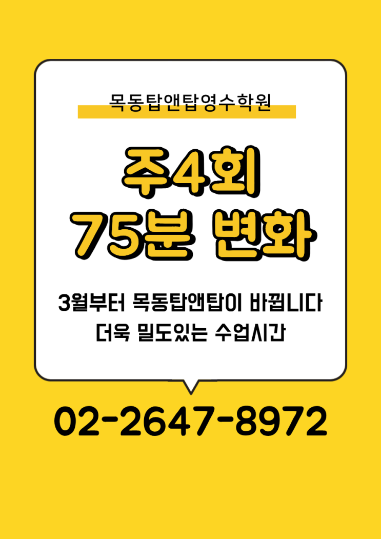 안녕하세요~! 목동탑앤탑고래영어입니다❤️ 오늘은 3월부터 우리목동고래 스케쥴이 변화하는데요 그 부분에대해 안내드립니다 60분씩 월~금 수업⇉ 75분씩 월~목 수업 ✓ 왜 스케쥴이 달라지나요~? 매일 60분씩 짧게 끊어가는 것보다, 주 4회 75분 수업을 통해 한 번 올 때 집중력 있게 공부하고 하루는 자기주도 학습이나 휴식을 갖는 것이 아이들의 장기적인 학습 태도에 더 도움이 됩니다! 늘어난 15분 동안은 아이들이 어려워하는 부분을 1:1로 더 세밀하게 봐줄 수 있는 시간이 확보됩니다✍️ ✓ 수업시간은 줄어들지 않아요! 60분×5회=300분 / 75분×4회=300분으로 전체 학습 시간은 동일하다는 점또한 안내드려요❤️....... <img src="https://blogthumb.pstatic.net/MjAyNjAyMDJfMTI4/MDAxNzcwMDE4OTc0ODE3._4DDB08YblLN-g0QR2rFcCTyzmxSeWH5Qj9mcBqglmkg.TmLluzdvyIOzEA2K5wkhgSmsdCARzYD7lowvWZY-jzgg.PNG/%C1%A6%B8%F1%C0%BB_%C0%D4%B7%C2%C7%D8%C1%D6%BC%BC%BF%E4._%283%29.png?type=s3" />