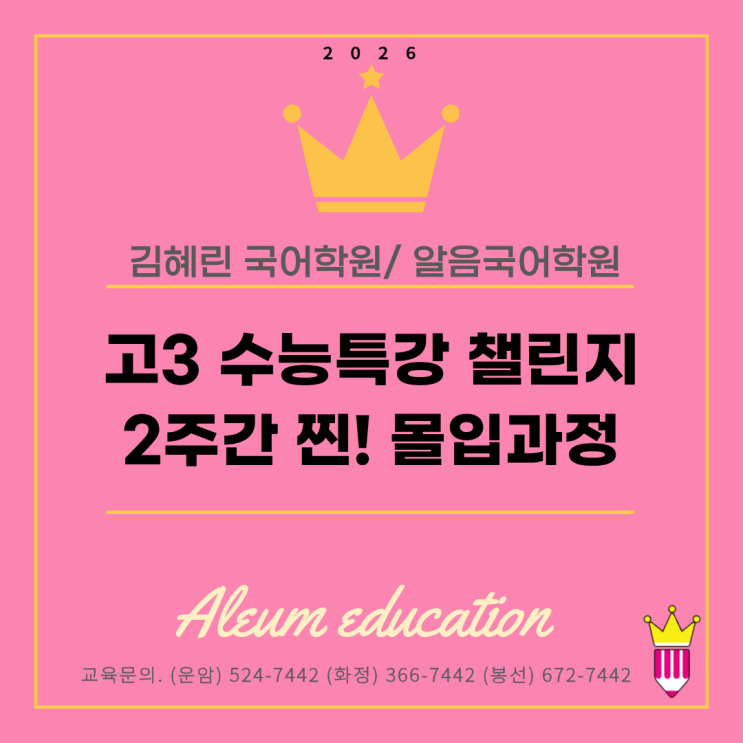 국어 성적을 올리고 싶은 고3이라면, 이 글 끝까지 읽어야 합니다. 매년 이맘때, 알음교육 고3 교실은 조용하지만 분명한 긴장감이 흐릅니다. 원장선생님이 수업 중 예고했던 '그 기간'이 드디어 시작되기 때문입니다. 수능특강 챌린지, 약 2주간 수능특강 문학·독서 전 범위를 직접 풀고, 오답을 정리하며, 스스로의 실력을 낱낱이 마주하는 시간. 서바이벌 프로그램도 아닌데, 탈락자가 속출한다는 말이 붙은 수능특강 챌린지를 알음교육에서 도입한 이유가 뭘까요? 이 과정을 통과해야만 진짜 실력을 쌓는 구조로 넘어갈 수 있다는 것을 알기 때문입니다. 2027학년도 수능특강 챌린지 안내 ■ 기간 : 2025년 2월 20일(금) ~ 3월 6일....... <img src="https://blogthumb.pstatic.net/MjAyNjAyMTlfMjA4/MDAxNzcxNDgyNTY2ODEz.tL2a1Kp3fxI3i4EanY_PGCcbZ7NHsLoRkMTylRngQnog.-6Jj27diwa4fPpD16trAsXY9vA5GlVF6xct7B4rYcl4g.PNG/%C1%A6%B8%F1%C0%BB_%C0%D4%B7%C2%C7%D8%C1%D6%BC%BC%BF%E4._%285%29.png?type=s3" />