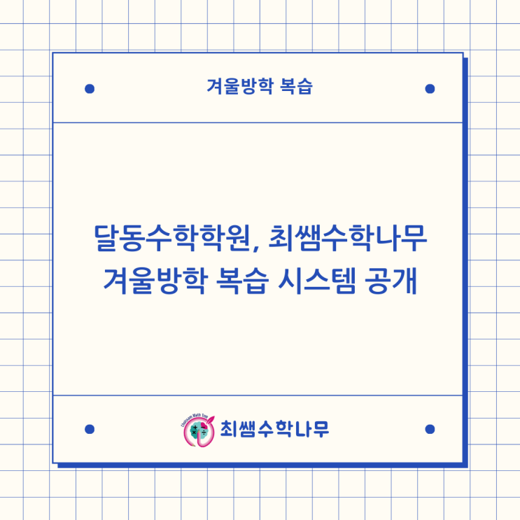 달동수학학원, 최쌤수학나무 겨울방학 복습 시스템 공개 안녕하세요. 울산최쌤입니다. 어느덧 겨울방학이 끝나가고 있습니다. 아이들을 지도하다 보면, 방학의 시간이 얼마나 중요한지 매번 느끼게 됩니다. 빠르게 지나간 몇 주였지만 아이들에게는 지난 학기를 다시 정리하고 흔들리던 개념을 바로 세우는 시간이었습니다. 이번 겨울방학, 저희 달동 최쌤수학나무에서는 재원생을 대상으로 단원별 복습을 진행했습니다. ❄️ 겨울방학에는 ‘속도’보다 ‘점검’을 선택합니다. 답보다 과정을 보는 수학학원 최쌤수학나무, 서술형 관리가 실력을 만듭니다. 최쌤수학나무의 겨울방학은 선행 진도를 빠르게 나가는 시간이 아닙니다. 이미 배운 내....... <img src="https://blogthumb.pstatic.net/MjAyNjAyMjJfMjc4/MDAxNzcxNzU1NDI3ODE1.mkwuGu04jCKq7AVC0sWRHeFxXbfmPGpWdHCxShWjNUsg.Ohqe6WwiAlZ1EPa1IGwfkgF7UfYP0mtwQD4MXP5sT6kg.PNG/%C3%D6%BD%DC%BC%F6%C7%D0%B3%AA%B9%AB_%287%29.png?type=s3" />