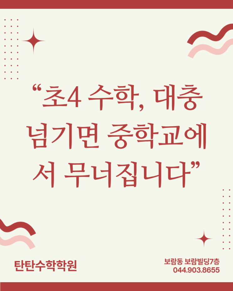 초4 수학, 그냥 지나가도 될까요? 중등 수학을 좌우하는 ‘진짜 분기점’입니다 많은 학부모님들이 이렇게 생각하십니다. “초등 4학년이면 아직 쉬운 단계 아닌가요?” 하지만 실제 현장에서 느끼는 것은 다릅니다. 초4 수학은 중등 수학의 ‘뿌리’를 만드는 시기입니다. 초4 수학, 왜 중요한가요? 초등 4학년 과정은 단순 계산을 넘어서 ‘개념 이해’와 ‘사고력’이 본격적으로 시작되는 단계입니다. 이 시기에 배우는 내용들은 중학교 수학과 직접 연결됩니다. 분수의 기초 소수 개념 도형의 이해 규칙 찾기와 문제 해결 이 모든 것들이 중등 수학에서 이렇게 이어집니다 분수 → 방정식, 함수 소수 → 실수 개념 도형 → 기하 영역 규칙 →....... <img src="https://blogthumb.pstatic.net/MjAyNjAzMjBfMTQ1/MDAxNzczOTYyNTI2NTky.BabOYsf8ETRrzhVLn_dxLMUoG71qarZLd6JTWGKo7Kog.T8mC1vMaxCx2idkneLgPSGfcsDwh-aojqJi0sZC5zcQg.PNG/900%A3%DFRed_and_Brown_Illustrative_Coffee_Instagram_Post%A3%DF20260320%A3%DF082154%A3%DF0000.png?type=s3" />