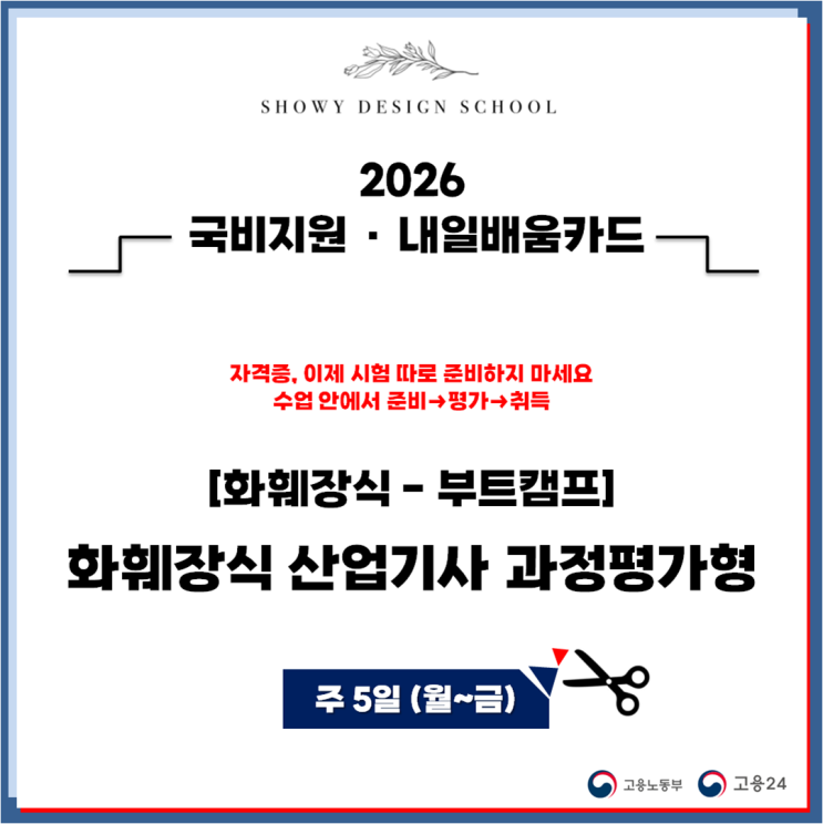 [국비지원 ㆍ 내일배움카드] SHOWY FLOWER ACADEMY 반갑습니다^^ 쇼위플라워 학원입니다. 화훼장식 산업기사 과정평가형 "OPEN" 되었습니다. 기다려주셨던 기간만큼, 현장에서 바로 써먹는 실무 중심 수업으로 준비해서 여러분을 기다리고 있겠습니다. 본 과정은 내일배움카드를 발급받을 수 있는 모두가 신청 가능합니다. (구직자/근로자/국취참여자/졸업예정자) 훈련정보 및 자비부담금액은 아래와 같습니다. * 내일배움카드로 국비지원받아 자비부담금액 270만원대에 수강이 가능합니다. - 관련 전공이 아니여도 화훼장식 기능사 자격증이 없다해도 우리의 '과정평가형 산업기사'는 조건 없이 도전할 수 있습니다. ▼ 수....... <img src="https://blogthumb.pstatic.net/MjAyNjAzMTNfNzQg/MDAxNzczMzc1OTYxOTA2.pDYKvYjGvSKrIty3p2O_bL6jTcn9DT1iHbDhmc85SYwg.8MmmDIFbGsIsYSBR7GLLXSaJClGTYjGVco8Ky9dftbsg.PNG/%B1%D7%B8%B21.png?type=s3" />