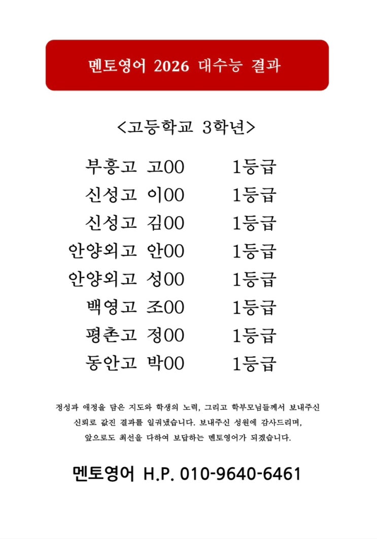 2026년 대수능이 끝났습니다. 그간의 노력의 결실이지만, 새로운 시작을 의미하기도 합니다. 학생들의 새로운 시작을 응원하며, 모두가 원하는 바를 이룰 수 있도록 애정과 열정으로 지도하는 멘토영어가 되겠습니다. <img src="https://blogthumb.pstatic.net/MjAyNTEyMDlfMjUz/MDAxNzY1MjUxNDU2MzMy.ZkYBQn8olm8uoDqaziALRKegs_xlnJ_N-aFXwfpRTNYg.AxgpHkxrSAVRsH7dgwaDUnaU4vJROQe_8MSfdtodvXAg.JPEG/IMG%A3%DF3460.jpg?type=s3" />
