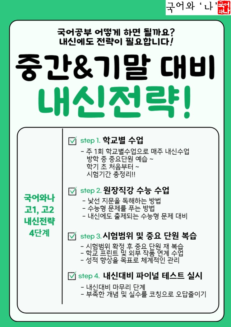 <국어와나 고1, 고2 시스템 안내> 1학교별 내신 + 2원장직강 수능국어 + 3주간평가 문제풀이로 수업 + 시험 기간 내신 대비 파이널 테스트 1회 또는 2회 실시 / ▶1. 학교별 고1, 고2 수업 안내입니다. 학교별 반은 <①방학 중 다음 학기 예습, ②개학 후 교과서 1단원 다시 수업 시작, ③시험 기간 3주~4주 전 총정리>로 수업하며, 학교 교과서 외에 학교 프린트, 수행평가 등 각 학교에 맞추어 수업이 진행됩니다. ▶2. 원장직강 수능 수업 안내입니다. 관내 모든 고등 내신시험이 교과서 밖 수능 형식으로 출제되고 있어, 단순 암기 형식으로는 좋은 성과를 내기 어렵습니다. 실제로 모의고사에서 1등급을 나오는 친구들이 내신에....... <img src="https://blogthumb.pstatic.net/MjAyNjAzMTRfMTA2/MDAxNzczNDc5Mjc2MTk2.qWKhpj5dtbFjdGtXe7ZsvdlsUzoJqaOx8z_WKIIlxhwg.qbXci4Ft3aB5d7MIfetbe0yuhQ65KVTM1C96VBXWF40g.JPEG/%B0%ED1%2C_%B0%ED2_%B3%BB%BD%C5%B4%EB%BA%F1_%C0%FC%B7%AB.jpg?type=s3" />