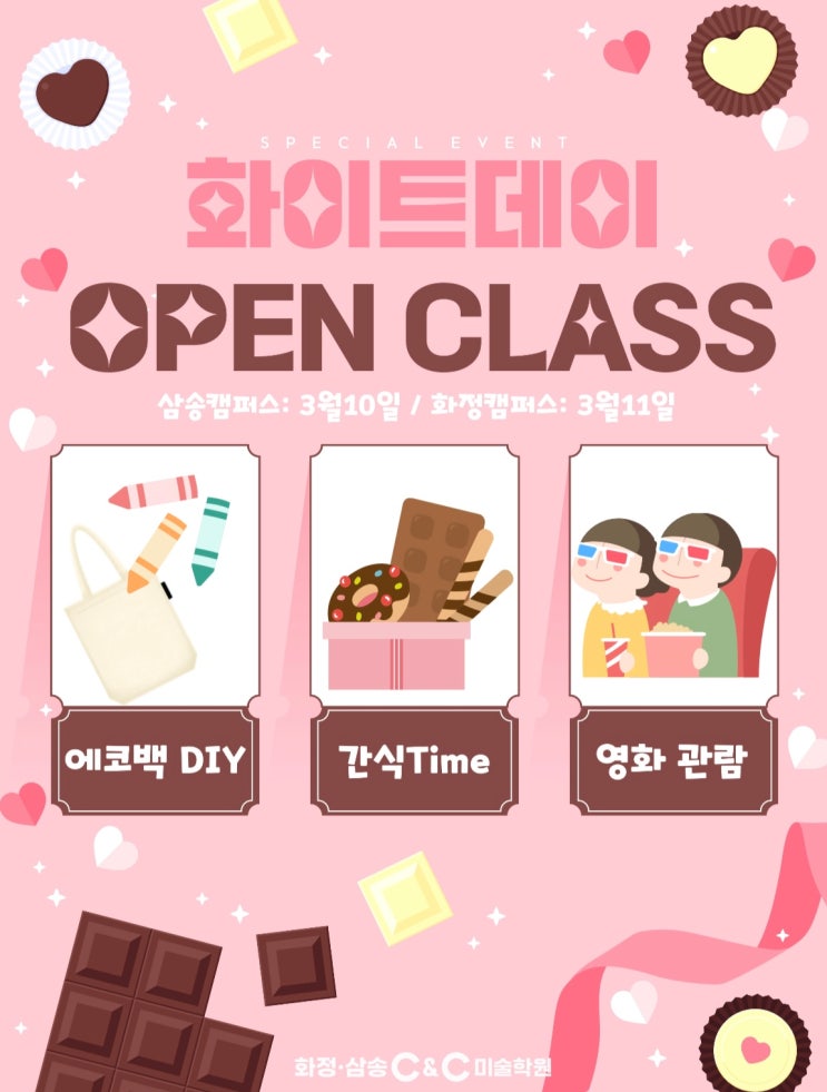 즐거움도 보법이 다른 화정 C&C 오픈클래스! “ 그림도 그리고, 웃음도 그리고, 화이트데이 맞이 화정 C&C 오픈클래스 현장 공개 ” #화정미술학원 #화정만화학원 #화정애니학원 #덕양구미술학원 #일산미술학원 #화정고근처미술학원 #화정중근처미술학원 #화수고근처미술학원 #화수중근처미술학원 #화정역근처미술학원 #중등미술 #취미미술 #만화 #애니 #디지털드로잉 #웹툰 #미대입시 #입시미술 #덕양구미대입시 #덕양구입시미술 #기초디자인 #기초소양 #기초조형 #상황표현 #칸만화 #발상과표현 안녕하세요 화정 C&C 미술학원입니다! 3월 11일, 화정씨앤씨에서는 재학생들과 외부 친구들이 함께하는 특별한 하루, 바로 오....... <img src="https://blogthumb.pstatic.net/MjAyNjAzMTJfMjA3/MDAxNzczMzE1MzU2MTEz.M-e89Yl-Vv0FP1Bmaq4aGJNazh0IbBdWRluDjs4PtHQg.J5EuLiHo5N8xgJUC_x9IsmmL--4vqQpnPhK7Tn_MWVgg.JPEG/KakaoTalk_20260306_221219969.jpg?type=s3" />