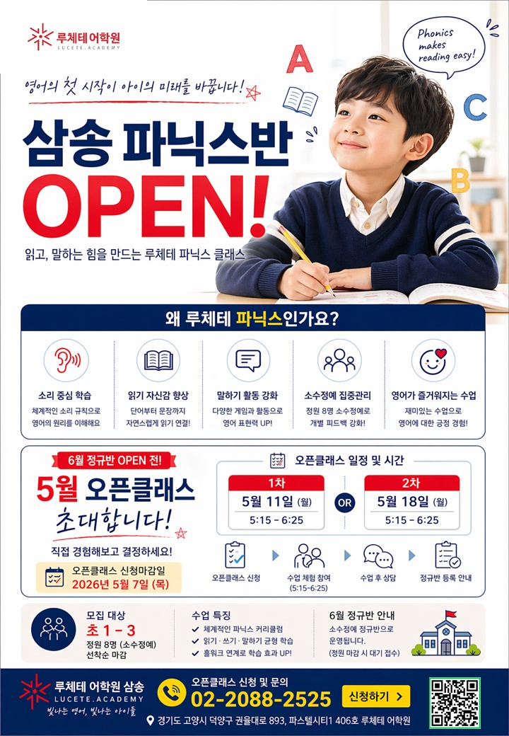 신원동 초등1~3학년 영어 첫 시작, 제대로 준비하세요! 아이들의 영어는 처음 시작이 가장 중요합니다. 어떤 방식으로 영어를 만나느냐에 따라 영어를 좋아하는 아이가 되기도 하고, 영어를 어렵게 느끼는 아이가 되기도 합니다. 그래서 루체테어학원 삼송에서는 단순히 알파벳을 외우고 소리만 따라 하는 수업이 아닌, 읽고, 말하는 힘을 만드는 프리미엄 파닉스 클래스 를 새롭게 오픈합니다. “루체테 파닉스반은 다릅니다!” 많은 학부모님들이 파닉스를 단순히 ABC를 배우고, 단어 몇 개 읽는 과정이라고 생각하십니다. 하지만 루체테어학원의 파닉스는 다릅니다. ✔ 소리의 원리를 이해하는 체계적인 파닉스 단순 암기가 아니라 왜 이런 소....... <img src="https://blogthumb.pstatic.net/MjAyNjA0MjNfMjk5/MDAxNzc2OTMxNjgxMTM5._7dcyc-G5FuHknn-DQM96D_Ytxmr9HyGwiSVRwRVinkg.4wWFO5BCXYUWEA3k0Qc4YFP_Nx0B3gN4hgxj-hoTkZIg.JPEG/%C6%C4%B4%D0%BD%BA%B9%DD.jpg?type=s3" />