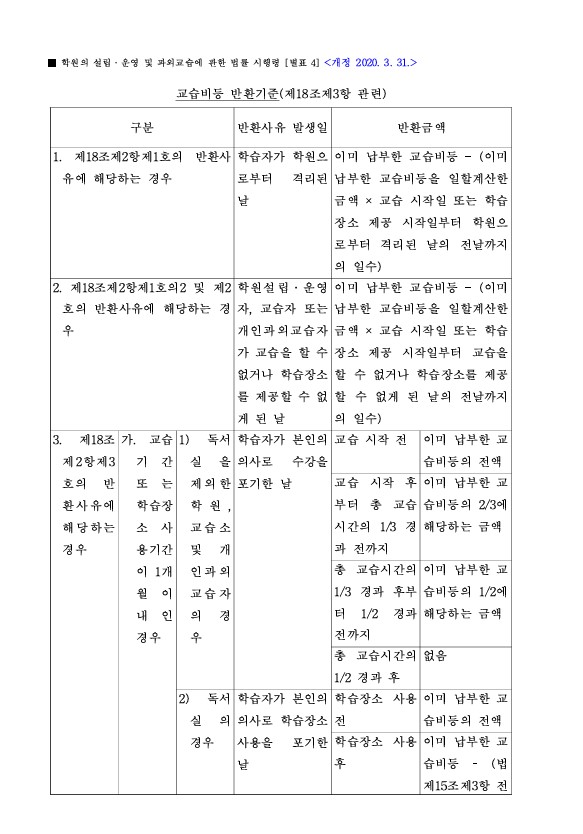 교습비등 반환기준(제18조제3항 관련)(학원의 설립ㆍ운영 및 과외교습에 관한 법률 시행령)