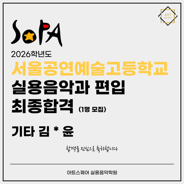 구리 아트스퀘어 실용음악학원 :: 서울공연예술고등학교 실용음악과 편입 최종합격! (1명모집) [구리실용음악학원,남양주실용음악학원]