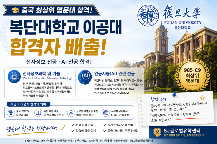 복단대학교 이공계 합격자 배출! 전자정보과학기술 · 인공지능학과 합격사례 공개 2026 중국대학 입시에서 중국 최상위권 명문대인 복단대학교 이공계 합격자를 배출했습니다. 특히 이번 결과는 단순 합격이 아니라, 핵심 미래산업 전공 합격이라는 점에서 더욱 의미가 큽니다. ✅ 합격자 전공 소개 1️⃣ 전자정보과학 및 기술 (Electronic Information Science and Technology) 이 전공은 쉽게 말해 ✔ 반도체 ✔ 통신 시스템 ✔ AI·데이터 처리 ✔ 컴퓨터 하드웨어/소프트웨어 융합 을 모두 다루는 공대 핵심 전공입니다. 특히 4차 산업혁명 시대에서 인공지능 빅데이터 스마트 디바이스 와 직접 연결되는 분야로, 졸업 후 취업 및 연구....... <img src="https://blogthumb.pstatic.net/MjAyNjA0MjVfMjc3/MDAxNzc3MDgyNzU4Mzg4.Lykgi_-hFH1DdMBcndwwEn494Qdr29PEU2DFZCvIktYg.YUiZ4km4O0-RjsG0eUXlw-OU-AzMeS_ew91ivUoETQ8g.PNG/794ad9b8-d2cd-454e-836d-2c3cb4d0a04b.png?type=s3" />