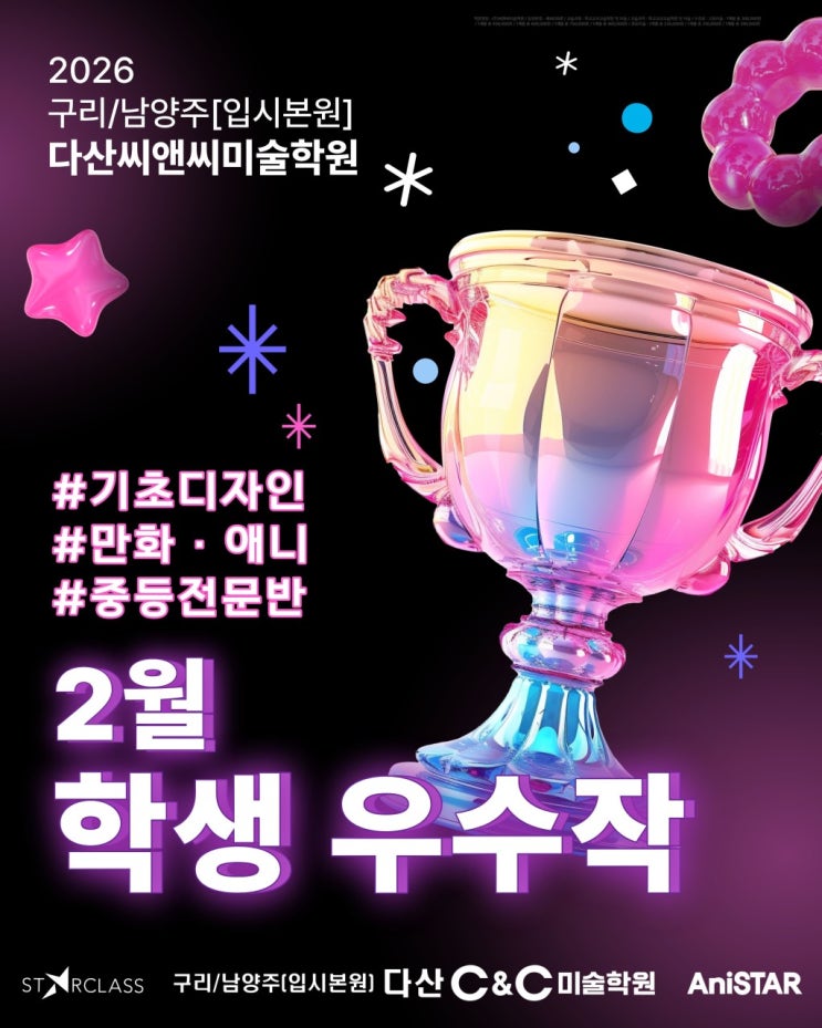 안녕하세요! 구리 · 남양주 미대입시 다산 C&C미술학원입니다! 새 학기가 시작되는 시기에는 많은 고등학생들과 학부모님들께서 미대입시 준비와 미술학원 선택에 대해 고민들이 많으십니다. ✔️ 지금 시작해도 괜찮을까? ✔️ 다른 학생들은 어느 정도 그림을 그릴까? ✔️ 미대입시는 어떻게 준비해야 할까? 이런 궁금증을 가지신 분들을 위해 이번 포스팅에서는 다산C&C미술학원 2월 우수 학생 그림을 소개해드리려고 합니다~! 이번 달에도 다양한 반에서 학생들의 좋은 결과가 나왔습니다. 기초디자인 · 애니 · 만화 · 중등전문반까지 각 과정에서 꾸준히 성장하고 있는 학생들의 그림입니다 스타클래스 수업에서는 서울대·국민대 등....... <img src="https://blogthumb.pstatic.net/MjAyNjAzMTRfMTcw/MDAxNzczNDUxOTk0NjMy.WxP9eTgzpUz8ARHEGPoEhUn-OZvHDCW-kfcL1FjVpRUg.mJgaQ5_m7XUZv-a7ALisVieqKwb6obZXqWk5rM-12jYg.JPEG/a_fb9Ud018svc17a6602frqnwj_g7xvlz.jpg?type=s3" />