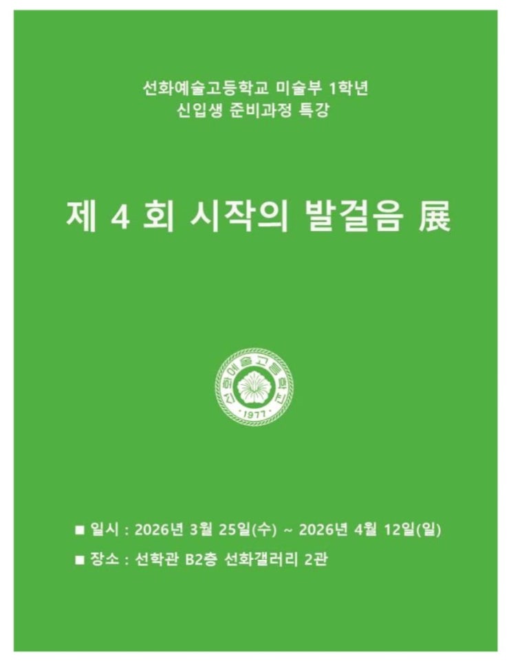 선화예고 전시회가 있어서 알려드립니다. 이번 1학년 미술부 학생들이 참여한 '신입생 준비 과정' 특강의 수업 결과물을 모아 <제 4회 시작의 발걸음전>을 합니다. 1. 전시 기간 밎 장소 -2026.3.25(수)~04~12(일), 선화갤러리 2관 2. 전시 관람 시간: 09:00~17:00 ※주말에도 전시 관람이 가능합니다. 3. 전시 작품 1학년 미술과 40명의 작품 4. 전시 관람 수칙 가: 축화, 화환 및 꽃다발은 정중히 사양합니다. 선화예술고등학교 라인미술학원은? 같은 5호선 라인에 있습니다. <img src="https://blogthumb.pstatic.net/MjAyNjAzMjVfMjg5/MDAxNzc0NDE5MDY1MTIx.HhngUos-wrKRtGaCjk413cC-_-pHApGtnytuOkPXhYcg.m7tNz3fcyR3-cu9KX1efuQdBVOl-R6MZIjJeYdJ7W9Eg.JPEG/KakaoTalk_20260325_144600915.jpg?type=s3" />