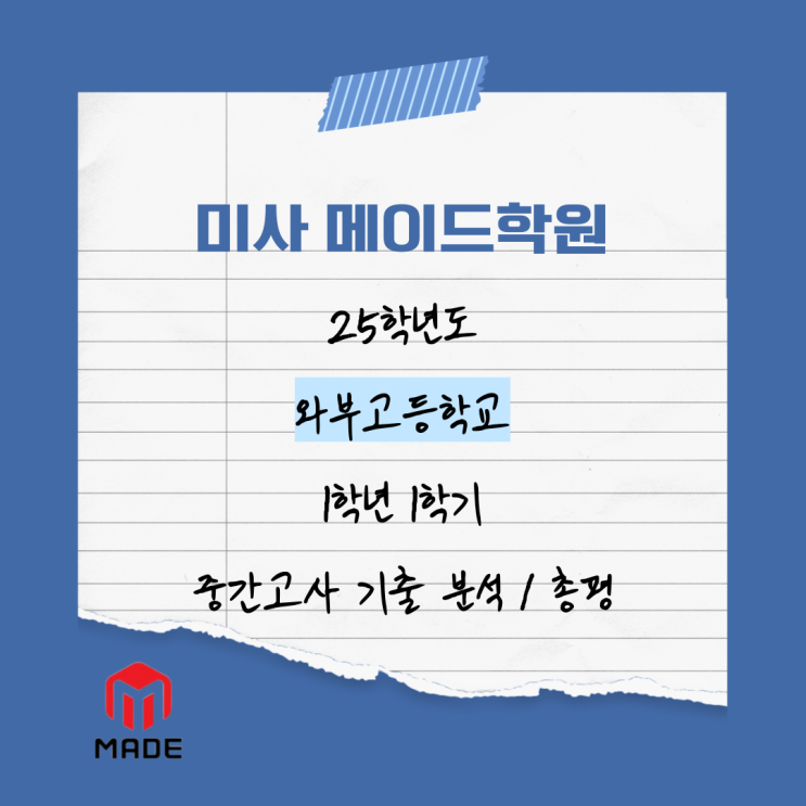 안녕하세요, 와부고 내신대비 수학학원 미사 메이드입니다. 오늘은 와부고등학교의 2025학년도 1학년 1학기 중간고사를 분석하고 총평과 학생들을 위한 앞으로의 학습 방향까지 제시해 보도록 하겠습니다. 이 고교는 중간고사나 기말고사에서 좋은 등급을 받기 어렵다는 말이 있는 고교 중 한 곳입니다. 기본적으로 시험이 어렵게 출제되기 때문에 가지고 있는 기본 실력이 뛰어나야 하며, 상위권 학생이 많아 경쟁 역시도 치열하다는 평이 많습니다. 쉽사리 넘을 수 없을 것 같은 이 허들, 어떻게 헤쳐나갈 수 있을지 저희와 함께 살펴봅시다. 학교 특징 들여다보기 지난해, 이 고등학교에서는 얼마나 많은 학생을 상위권 대학에 보냈을까요? 서....... <img src="https://blogthumb.pstatic.net/MjAyNjAzMjZfMjQz/MDAxNzc0NTM0NzM0MTI0.KvpRPvhcWB42gL4vXFRPEQctk05Z0gzmd1T4r6hqcGkg.5bT_626gPstogGUS6inn8atjF09UuQaQTDTrL-z4O-4g.PNG/001.png?type=s3" />