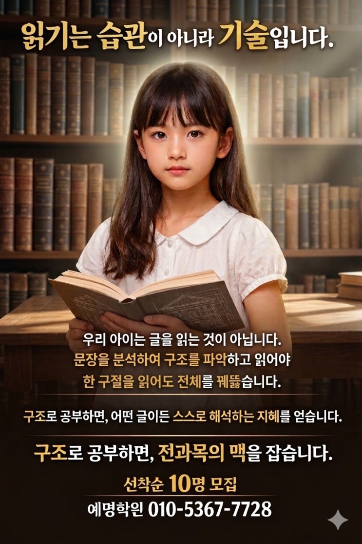 '읽기의 기술'을 배우며, 우리 아이가 꿈꾸는 세상을 함께 그려보세요! 안녕하세요, 여러분! 따뜻한 봄바람이 불어오는 요즘, 우리 아이들의 꿈도 함께 피어나고 있나요? 오늘은 '읽기의 기술'이라는 주제로 우리 아이들의 꿈을 더욱 풍성하게 만들어줄 수 있는 방법에 대해 이야기해 보려고 합니다. '읽기'는 단순히 글자를 읽는 것이 아니에요! 우리 아이들은 어릴 적부터 수많은 책을 접하며 세상을 배우고, 꿈을 키워나갑니다. 하지만 단순히 글자를 읽는 것만으로는 아이들이 꿈을 이루는 데 부족함이 있을 수 있습니다. '읽기의 기술'을 배우며 아이들은 글 속에 담긴 의미를 파악하고, 자신의 생....... <img src="https://blogthumb.pstatic.net/MjAyNjAzMjdfOTYg/MDAxNzc0NTg1ODIyMjc1.NVZJ5-qa5kDFmKn8UI1VGziM6yI982T8LszrJ1t54SYg.oAI0Xb1qIvryjdT-KP8pzm4zcA6iP2HVbbLXiWWVwmAg.JPEG/IMG%A3%DF7462.jpg?type=s3" />