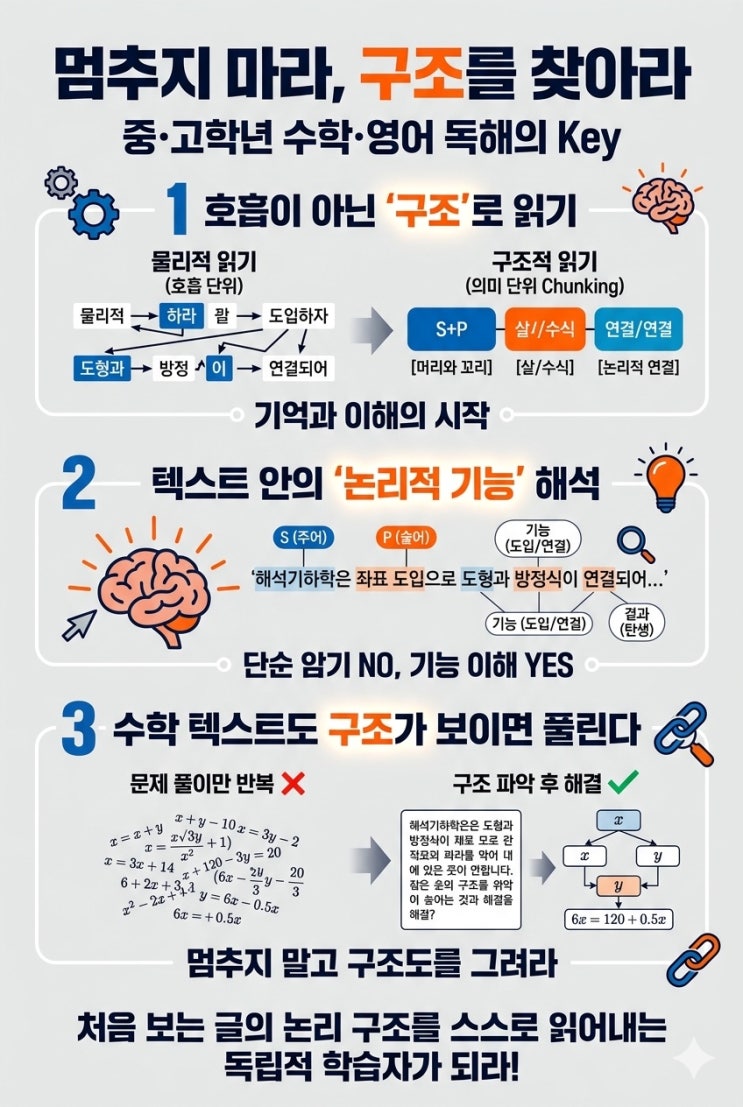 안녕하세요, 학부모님. 혹시 우리 아이가 영어 단어를 다 외웠는데도 해석을 못 하거나, 수학 문제를 읽다가 "무슨 말인지 모르겠어"라며 펜을 놓아버리진 않나요? 많은 중·고학년 아이들이 겪는 이 문제의 핵심은 지능이 아니라 '독립적인 구조 파악 능력'의 부재에 있습니다. 오늘 우리 아이들의 학습을 송두리째 바꿀 '구조적 학습(Structural Learning)'의 비밀을 공유합니다. 1. '물리적 읽기'라는 가짜 공부의 함정 아이들이 글을 읽을 때 단순히 폐활량에 맞춰 숨을 쉬는 지점에서 끊어 읽는 것을 보신 적 있나요? 이것을 '물리적 읽기'라고 합니다. 글자는 읽지만 머릿속에는 단어 조....... <img src="https://blogthumb.pstatic.net/MjAyNjAzMjJfNTAg/MDAxNzc0MTg0MTEwODQ1.BwfNIKQntof5LMlAFDjHlBm7CfjRMULgwTvhcxKHYqEg.Q04XBwXHNTOIBn006YUb1JsOEk1D8vM-4vPsZ03aAIAg.JPEG/IMG%A3%DF7419.jpg?type=s3" />