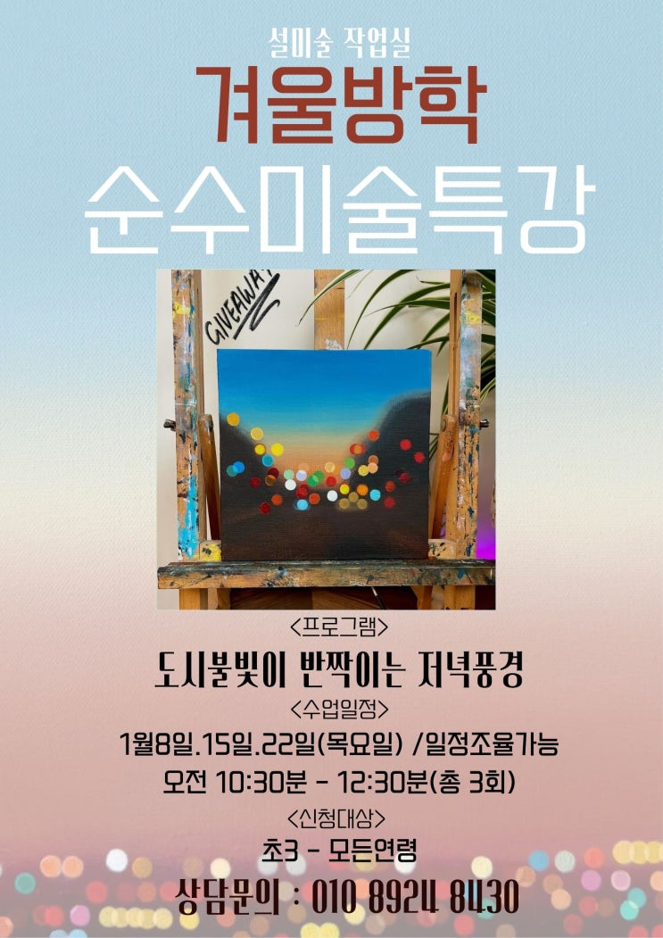 안녕하세요! 설미술작업실(미술교습소) 입니다:) 겨울방학이 시작되면 아이들에게 가장 고민되는 부분이 있어요. “집에서 시간은 길고… 뭘 해야 알차게 보냈다 할까?” 엄마들의 이런 고민을 덜어줄 겨울방학 맞춤 순수미술 특강이 설미술 작업실에서 열립니다 :) 이번 겨울 특강은 ‘도시 불빛이 반짝이는 저녁풍경’을 주제로, 아이들이 직접 색을 섞고, 명도를 조절하고, 빛의 흐름을 표현해보는 본격 회화 수업이에요. 아이들이 좋아할 만한 화려함과 전문적인 미술 교육이 동시에 담긴 프로그램이라 초등부터 고학년까지 난이도 조절이 자연스럽게 가능하답니다. 특히 동천동 초등미술 방학수업 찾으시는 분들께 꼭 맞는 과정입니다. 아이....... <img src="https://blogthumb.pstatic.net/MjAyNTExMjhfMTYx/MDAxNzY0MzEyNDY5MzI5.uJB7Za_MhV5QGgbyhN8W6_4vu3Yq3wCaRKtzNONa9h8g.lvSkJxHWYYRdaQSj56-Ob0ALIq79umWF7z7EEjsZ6Jcg.JPEG/%BB%E7%BA%BB_-%B0%DC%BF%EF%B9%E6%C7%D0_%28%C6%F7%BD%BA%C5%CD%29_%281%291.jpg?type=s3" />