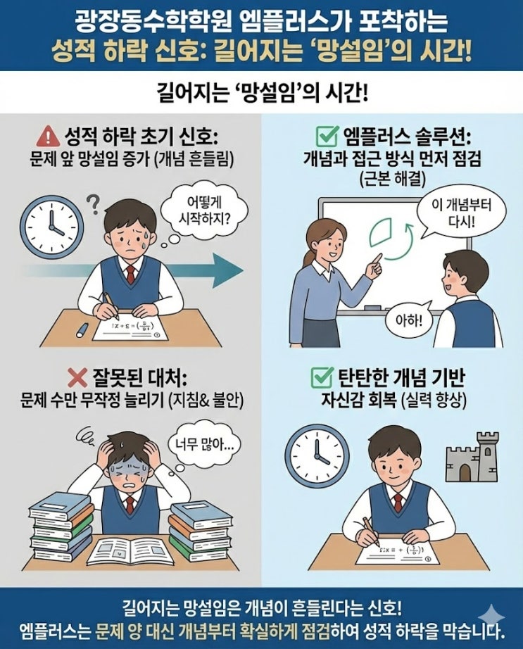 안녕하세요. 광장동수학학원 엠플러스입니다✨ 수학 성적이 떨어질 때를 보면 대부분 어느 날 갑자기 망한 것처럼 느껴집니다. “지난 시험까진 괜찮았는데 왜 이번엔 이렇지?” “실력이 갑자기 떨어진 것 같아요.” 이런 말이 나오기도 합니다. 하지만 실제로는 성적이 떨어지기 전에 이미 몇 가지 신호가 먼저 나타나는 경우가 많습니다. 이 신호를 알아차리지 못하고 넘어가면 다음 시험에서도 비슷한 결과가 반복되기 쉽습니다. 광장동수학학원 엠플러스에서도 성적이 하락한 학생들을 살펴보면 시험 전부터 공통적으로 보이는 변화들이 있습니다. 문제를 풀 때 망설이는 시간이 눈에 띄게 늘어납니다 성적이 떨어지기 시작하는 학생들은 문....... <img src="https://blogthumb.pstatic.net/MjAyNjAyMjBfOTcg/MDAxNzcxNTUxNDQxNjY1.ehPcxvv-jeN1Q5FV3IY2SuhMUyAiqmWd8MmziL__DE8g.u958mQ9jMBczTBtSUsmINEMCdF4Y614mocOGyZ_3YZsg.JPEG/unnamed.jpg?type=s3" />