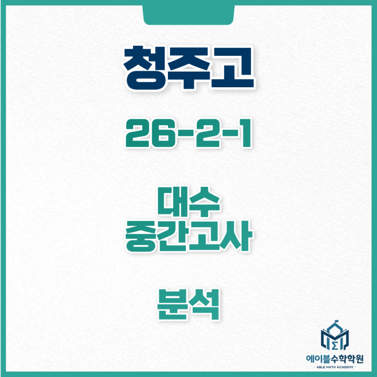 안녕하세요 에이블 수학학원입니다 청주고 26년 2학년 1학기 대수 중간고사에 대해 말씀드리겠습니다. 총평입니다 학교프린트가 따로 없어 교과서 위주로 공부한 학생들에게 어려운 시험입니다. 청주고 2학년이면 다 아실겁니다. 수학선생님께서 시험을 호락호락하게 내신적이 없다는 사실을.. 우선 청주고 2학년 시험스타일은 타 학년과는 다릅니다. 1학년 때 배운 개념을 까먹으면 아무리 공부해도 좋은 점수를 받을 수 없기 때문에 1학년 때부터 차곡차곡 쌓아두는 것이 매우 중요합니다. 이번시험도 그런 의미에서는 최상위권에게도 쉽지 않은시험 중 하위권에게는 지옥같은 시험일 겁니다. 1등급 변별문제 15,16, 단답2,3 2등급 변별문제 10....... <img src="https://blogthumb.pstatic.net/MjAyNjA0MjlfMTM5/MDAxNzc3NDc0Nzg5OTU0.thenuIgyzTtq5CBVj25S55XZeW99oVpprLjsQQzi5dMg.29w3mjUDWYNdeO7tqJLTaJyZ8k_xSCA6jOsxqPtVexwg.PNG/%C1%A6%B8%F1%C0%BB_%C0%D4%B7%C2%C7%D8%C1%D6%BC%BC%BF%E4._%286%29.png?type=s3" />