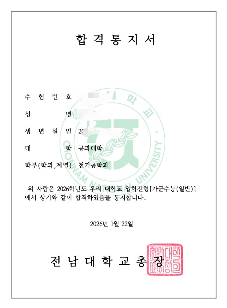 2026학년도 정시 합격 전남대학교 공과대학