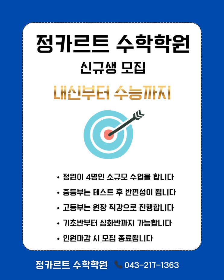 안녕하세요, 주성동 수학학원 정카르트입니다. 3월 개강을 앞두고 정카르트에서 신규생을 모집합니다! 주성동 신흥고 근처에 위치한 정카르트 수학학원에서는 초5부터 중등부, 고등부까지 수학을 한 곳에서 마스터할 수 있는 장기플랜을 세워 수업을 진행하고 있습니다 :) 학교별 내신 대비부터 수능, 대입까지 완성하는 정카르트 커리로 진짜 수학 실력을 만들어가는 수학학원. 현재 정원이 찬 반은 대기 가능하며, 정원이 차지 않은 반에 한하여 3월 등록이 가능합니다. 043.217.1363 <img src="https://blogthumb.pstatic.net/MjAyNjAyMTlfMjkw/MDAxNzcxNDI5ODQwMDUw.AtfqEHj0f0yWSGu-g1P3R6DVGZuLXkoVSEY4DaYomaYg.ZPPmWh_EYbZjG1DWyeNUMgfj-HMITZmIYgT4522NkM4g.PNG/%C1%A4%C4%AB%B8%A3%C6%AE_%BD%C5%C0%D4%BB%FD_%B8%F0%C1%FD.png?type=s3" />