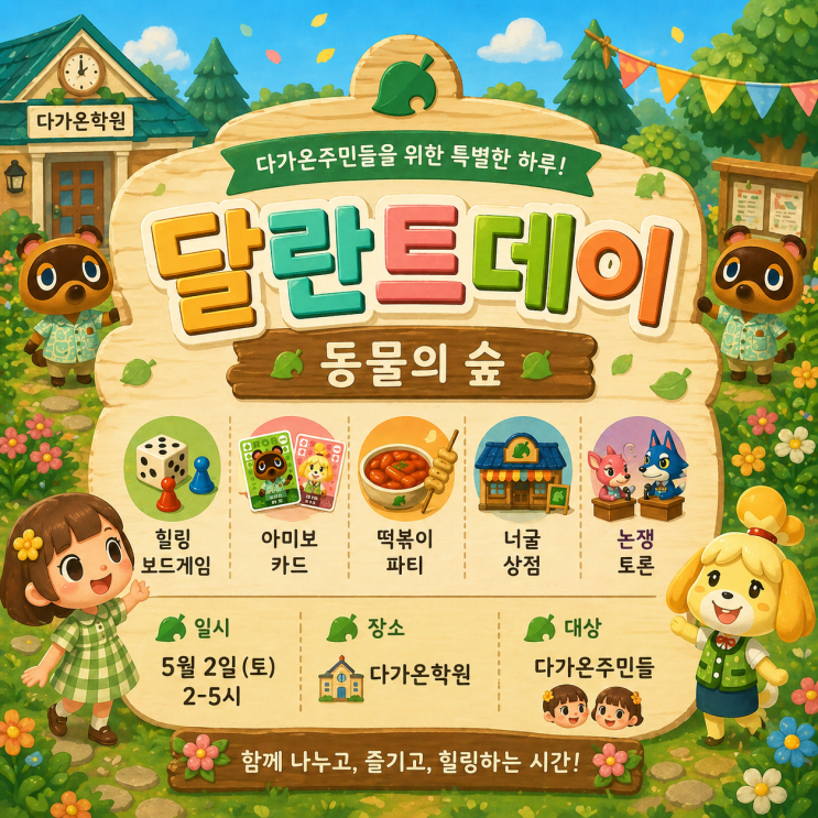 안녕하세요, 다가온학원입니다 이번 달란트데이는 아이들이 정말 좋아할 수밖에 없는 컨셉으로 준비했어요. 바로, “동물의 숲” 감성 힐링 마을입니다 단순한 이벤트가 아니라 아이들이 직접 놀고, 먹고, 교환하고, 이야기까지 나누는 작은 하루 마을을 만드는 시간이에요. 일정 안내 5월 2일 토요일 오후 2시 ~ 5시 이번 달란트데이에서는 아이들이 각자 ‘마을 주민’이 되어 자유롭게 공간을 돌아다니며 활동하게 됩니다. 입장할 때 랜덤으로 받는 아미보 카드, 오늘의 시작을 더 특별하게 만들어줘요 ⸻ 힐링 보드게임 경쟁보다는 “함께 웃는 시간”에 집중했습니다 할리갈리, 카드게임, 밸런스 게임까지 친....... <img src="https://blogthumb.pstatic.net/MjAyNjA0MjdfOTAg/MDAxNzc3MjY0NTQ3Njc4.x-zKanoBvnU9tqfCefCpNsdT6XSfhWxew6GCz3CtIqsg.ZhI_CryKaGcxC4HU2-dunSS-L86A51Nl0F3ryIAzF0Ag.PNG/KakaoTalk_20260427_133522320.png?type=s3" />