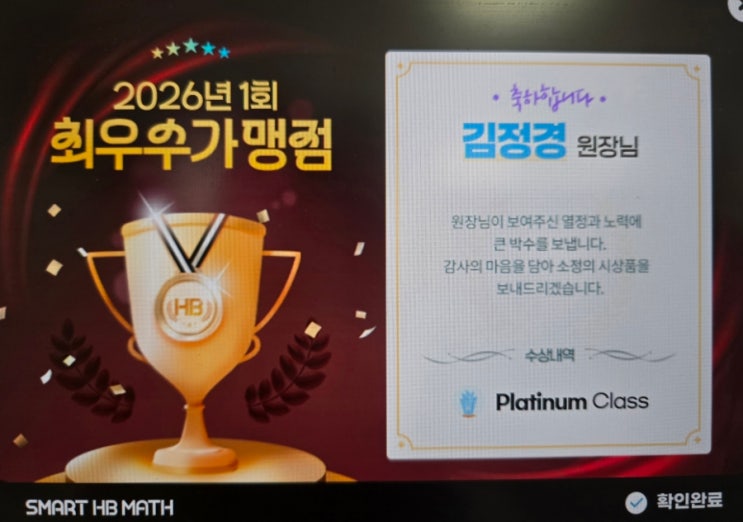 스마트해법수학 2026년도 제 1회 최우수 가맹점 상 수상 축하 메세지
