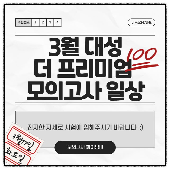 안녕하세요 이투스 247 마포학원입니다. 오늘은 2027 재수정규반 개강 후 첫 시험인 3월 대성 더프리미엄 모의고사 실시일입니다. 첫 시험은 누구나 떨리기 마련인데요~ 점수에 연연하기보다는 현재 실력을 정확하게 파악하고, 앞으로의 학습방향을 설정하는데에 목표를 두고 진지한 자세로 최선을 다해 시험에 임해주시기 바랍니다. 그럼 오늘도 이투스 247 마포학원 재원생들의 모의고사 일상을 한 번 들여다볼까요? :) 저를 따라오세요~~~ 활기찬 봄기운이 스며든 3월의 이투스 247 마포점 모습입니다. 예쁜 꽃이 재원생들을 맞이하고 있는데요~ 너무 싱그럽고 아름답지 않나요? 여러분들의 3월도 예쁜 꽃처럼 빛나길 바라겠습니다. 오늘 시험....... <img src="https://blogthumb.pstatic.net/MjAyNjAzMTdfMjQz/MDAxNzczNzA3MDI4ODU4.q4O8MQB1qg7SBC24hZMoq-jU9-cnO5EyWJnWL27Z4xwg.LBhXMew0Uw6KP8DO1lICsmOwfaEcLboAZjiCwLZPFVIg.PNG/image.png?type=s3" />