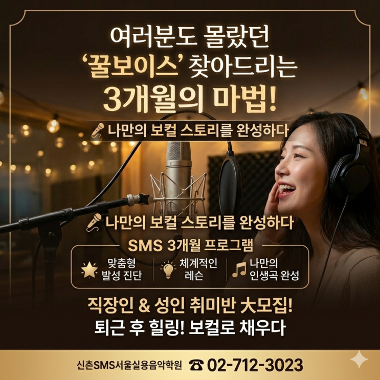 안녕하세요:) 음악으로 일상을 바꾸는 신촌SMS서울실용음악학원입니다. 오늘 이동하는 길에, 이어폰 너머로 들려오는 노래를 흥얼거리며 이런 생각 해보지 않으셨나요? "나도 저 가수처럼 고음을 시원하게 내보고 싶다." "회식 자리에서 당당하게 한 곡 부를 수 있다면 얼마나 좋을까?" 하지만 막상 입을 떼면 목이 조여오고, 음정은 불안하고... "나는 타고난 음치니까"라며 포기하곤 하셨죠. 결론부터 말씀드리면, 음치는 없습니다. 단지 소리를 내는 '방법'을 배우지 못했을 뿐입니다. 왜 독학으로는 실력이 늘지 않을까요? 유튜브에서 '고음 잘 내는 법', '복식호흡 하는 법' 영....... <img src="https://blogthumb.pstatic.net/MjAyNjAzMTdfNjgg/MDAxNzczNzIzNTE0ODEx.1WGfpBBVYUI_raoQbGFvsB99TDmqYMRu-zJr7U-pr3Mg.QRGO-iA_hnmXfzkrdERgyFH2DYkaTGwHq91EPWWLDxog.PNG/Gemini_Generated_Image_gyghvugyghvugygh.png?type=s3" />