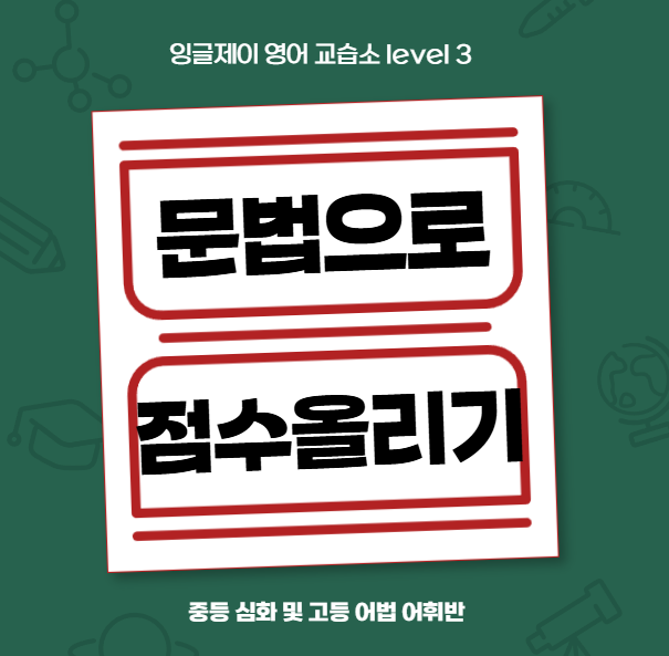 이런 학생에게 딱 필요한 문법 심화반입니다 중학교 3학년과 고등학생들에게 가장 많이 듣는 말이 있어요 문법은 다 배웠는데 문제를 풀면 계속 틀려요 3점 어법 문제 하나 버리고 가면 안 될까요 문제는 단순히 문법문제를 뛰어넘는 어휘,문법 연계학습 고등 내신을 위한 문법 연습이 안 되어 있기 때문입니다 중학교 3학년 즘 되면 리딩실력은 제자리이고 문법실력은 점점 도퇘되어 다시 개념 정리 부터 하자니 책 앞부분만 너덜너덜 문법 심화반 수업 방향 ▶ 중등 내신 고등 모의고사 출제 포인트 중심 ▶ 출제자의 의도 빠르게 파악하는 방법 중심 ▶ 문법 ⇒ 문장 해석 ⇒ 문제 적용까지 한 흐름으로 연결 이런 학생에게 추천합니다 ▶ 중....... <img src="https://blogthumb.pstatic.net/MjAyNjAxMjlfMjAg/MDAxNzY5Njg5MTY5MTM2.t0APRYwjyNYomit6MU_yKN1w4oOF3KSn9XdEthgiLlQg._-BC4VHqPABmsAXKuI1Nk9Ez6V31pIixSEWzlJKC5aog.PNG/image.png?type=s3" />