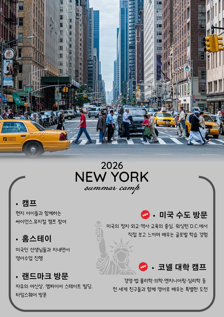 2026년 뉴욕 & 워싱턴 D.C. 써머 캠프가 돌아왔습니다 한 번 다녀온 아이가 다시 선택하는 캠프. 그 이유는 분명합니다. 단순한 여행이 아닌, 아이의 시야를 바꾸는 경험이기 때문입니다. 2026 NEW YORK SUMMER CAMP 2026년, 더 넓어진 도시에서 더 깊어진 프로그램으로 돌아왔습니다. 이번 캠프는 뉴욕을 중심으로 미국 수도 워싱턴 D.C. 방문, 그리고 코넬 대학교 캠프까지 확장되었습니다. ✨ 미국 현지인의 ‘진짜 정보’로 진행되는 캠프 7년간 이월드와 함께했던 원어민 선생님을 중심으로 진행되는 캠프. 관광이 아닌 현지에서 실제로 살아가는 사람들의 시선으로 준비된 일정입니다. 그래서 더 안전하고, 그래서 더 깊....... <img src="https://blogthumb.pstatic.net/MjAyNjAyMTlfMjEy/MDAxNzcxNDg5OTE1MDQ0.o7S2wgl6yJ1GEbG5xj_dMSvnU5T3HOzpwgirtscCAJkg.DjhnH2nBgqYItRgMEkrtTPREsNwIV63pNluGg62eEgkg.PNG/2026_%B4%BA%BF%E5%C4%B7%C7%C11.png?type=s3" />