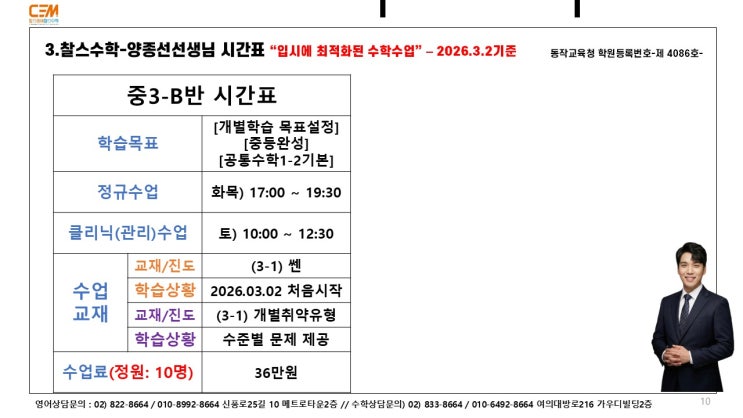 안녕하세요. [대방동수학학원], [신길동수학학원] 찰스수학입니다. 2026년 3월 2일 월요일부터 찰스수학은 당분간 중3부터만 수업이 가능하오니 참고해주시면 감사하겠습니다. 중등부터 고등부 선생님께 고등을 준비해보세요! 1. 중3-B반 안내사항 1) 학습목표: 중등 전과정 완성 -> 공통수학1, 공통수학2 학습 -> 기본/심화/응용 3단계로 문제집 단계별 학습 2) 수업시간: 정규) 화요일, 목요일-17:00 ~ 19:30 클리닉) 토요일-10:00 ~ 12:30 3) 수업정원: 10명 4) 수업안내 주2회 정규수업에서는 진도학습 주1회 관리수업으로 주2회 정규수업 내용 -> 개별 이해도 점검 및 테스트 & 오답정리 & 개별 유사오답문제해결 5) 진도....... <img src="https://blogthumb.pstatic.net/MjAyNjAzMTVfMzUg/MDAxNzczNTcxODk5NTc3.ft_hQvy8DpxP4ak1Ahmq_UnwoCi2c0ZZeXdHN1FAvvIg.e-7yVKDRTBfYbY9xFpdImZdn_itVniaOCRsAskfo9nwg.JPEG/%BD%BD%B6%F3%C0%CC%B5%E510.JPG?type=s3" />