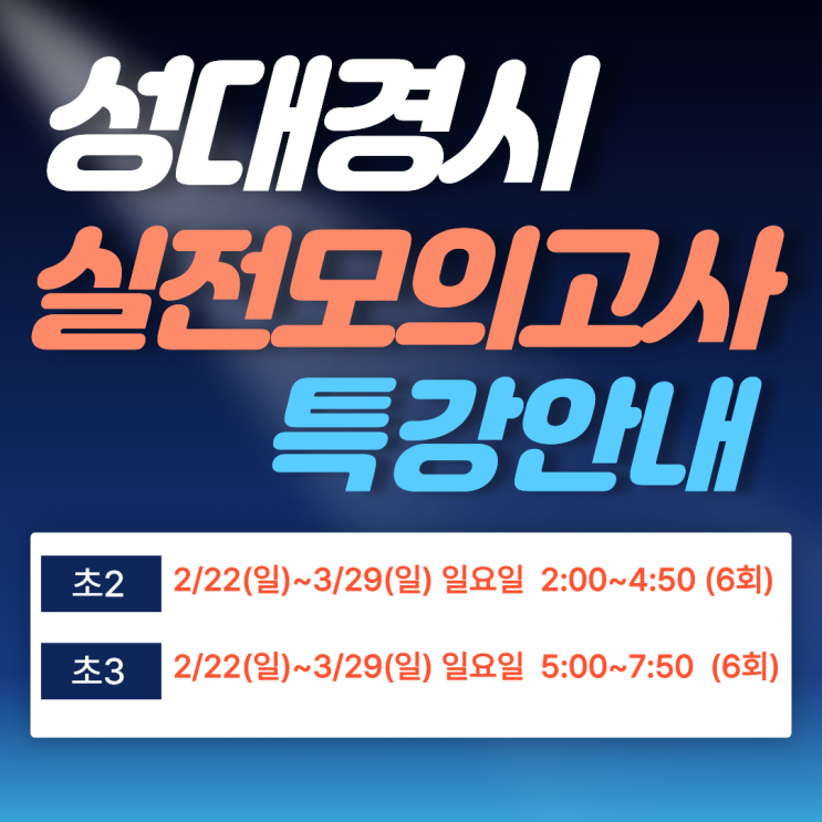 ✔️수업일정 초2 - 일요일 14:00~16:50 2/22(일), 3/1(일), 8(일), 15(일), 22일(일), 29(일) 총 6회 초3- 일요일 17:00~19:50 2/22(일), 3/1(일), 8(일), 15(일), 22일(일), 29(일) 총 6회 성대경시, 결과를 만든 경험이 있는 수업이어야 합니다 성대경시는 단기간 요령으로 대비할 수 있는 시험이 아닙니다. 출제 흐름, 난이도 변화, 학년별 함정 유형까지 오랜 기간 시험을 직접 지도해 본 경험이 결과를 좌우합니다. 그래서 성대경시를 준비하는 학부모님들께 가장 먼저 드리고 싶은 말씀은 이것입니다. “누가 가르치느냐가, 어떤 문제집을 푸느냐보다 중요합니다.” ✔️결과로 증명해 온 지도 경험 다년간 성대경시를 지도하며 ‘대상’....... <img src="https://blogthumb.pstatic.net/MjAyNjAxMjFfMzgg/MDAxNzY4OTczNjMzNjE0.3wMIdDgO-kvo1aC7IVuhc2qG5vq5NqIO7HnIYDLop44g.Pxg9zPS8ymlbr619icw5hj-c9WCykrJXgStRP4uwiHQg.PNG/%BC%BA%B4%EB%B0%E6%BD%C3_%283%29.png?type=s3" />