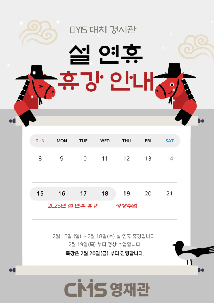 안녕하세요, CMS대치 경시관 입니다. 2026 설 휴강 안내 드립니다. 일정을 꼭 확인하시고, 수강에 착오 없으시길 바랍니다. 휴강 기간 2/15(일) ~ 2/18(수) 위 기간에는 전화 문의 및 수납이 불가합니다. 감사합니다. ※방학 특강은 2월 20일 (금요일) 부터 다시 진행 합니다. <img src="https://blogthumb.pstatic.net/MjAyNjAxMjNfOTIg/MDAxNzY5MTU0MDc3NjM2.CFSqJqATv8zfS3D_7NKHtdoRelWwXJD7EQG1Y-QhLI0g.yRXvcuhKHr933N3dAdOSoN7imIFv4R_eWcKsK208YQ4g.PNG/%B1%B8%C1%A4%BF%AC%C8%DE.png?type=s3" />