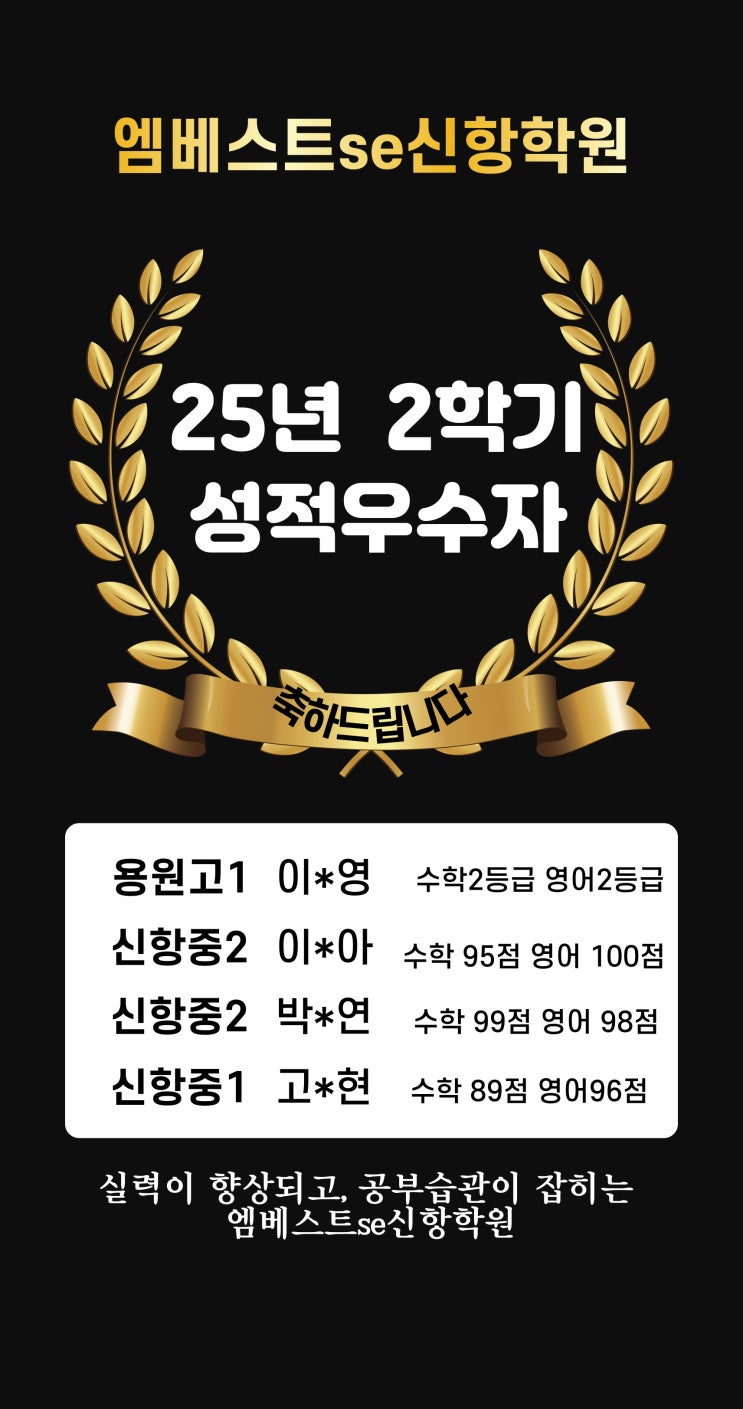 2025년 2학기 성적 우수자 발표! 실력과 습관이 동시에 잡힌 엠베스트se신항학원