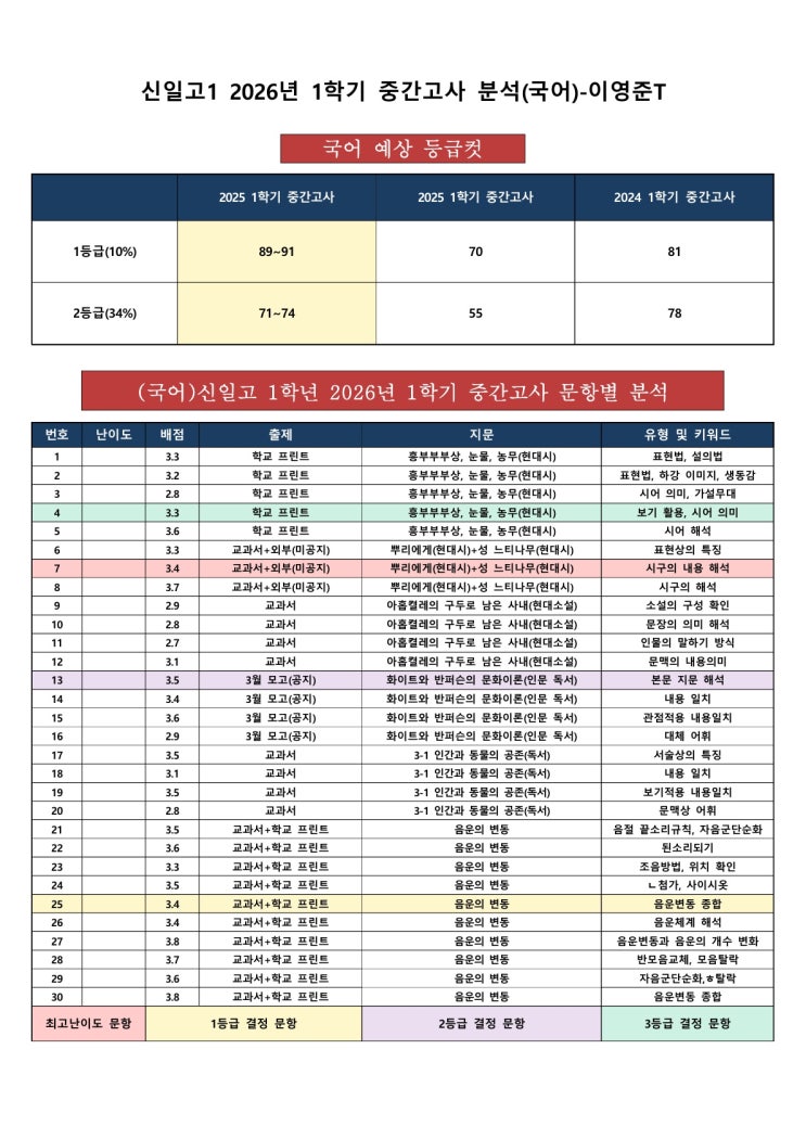 신일고1 국어내신 2026 1학기 중간고사 분석-이영준T(송동인 학원)