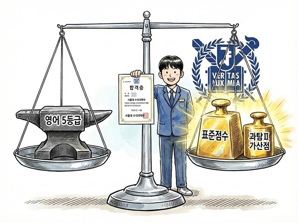 안녕하세요~ 우리 아이들 생각의 힘을 키우는 신월초중등수학 소마사고력학원입니다. 오늘은 서울대 입시의 한 단편을 통해 입시에 대한 기본적 이해를 해보고자 합니다. 대학입시는 교육과정이 개편될때 마다 큰 폭으로 변화하며 개편이 안되더라도 대학별로는 매년 조금씩 바뀌곤 합니다. 그러나 아무리 바뀌어도 내신과 수능이 중요하다는것은 불변의 진리입니다. 2026학년도 서울대학교 정시 모집에서 영어 5등급을 받은 수험생이 자연계열 최상위 학과인 수리과학부에 합격하는 이례적인 결과가 나왔습니다. 통념상 서울 주요 대학 진학조차 불투명한 영어 성적으로 국내 최고 학부에 합격한 이 사례는 입시가 단순한 평균 등급 싸움이 아닌....... <img src="https://blogthumb.pstatic.net/MjAyNjAzMDJfOTcg/MDAxNzcyNDQ5MDc5NTAz.D48S9Z2TaE-Z__UvfabOoANNXdLzOWa3MM9e4KtvCPgg.UOOS03cX6bEtpVA6WCHG98uK4iU-GnGfQoQUkxXxIgYg.JPEG/4109_3961_3425.jpg?type=s3" />