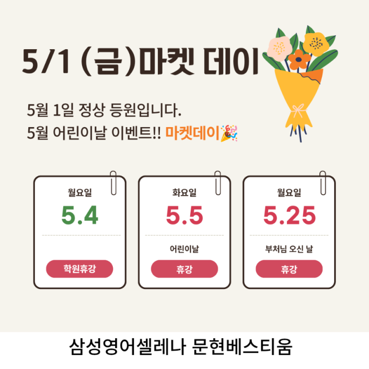5월 마켓데이 및 휴강 안내-삼성영어 문현베스티움