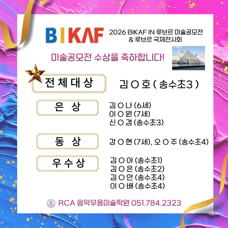 rca 미술 친구^^ 비카프미술공모전에서 " 전체대상 " 수상♥ 루브르 전시 및 시상식까지 참여한 rca친구! 1월에 진행되었던 미술 공모전에 RCA친구들이 "전체대상" 및 은상,동상, 우수상등 우수한 성적으로 수상하였습니다. 전체대상인 학생은 프랑스 파리 루브르박물관 국제전시관에 그림이 전시되고 시상식 참여로 프랑스를 다녀왔습니다.^^ 수상한 RCA친구들 ~ 축하해주세요♥ RCA에서 꾸준히 배운 학생들의 좋은 성적이 선생님들에게 큰 힘이 됩니다. 앞으로도 "생각을 키우는 회화수업+ 회화의 기본기를 중시"하는 RCA가 되겠습니다. 감사합니다 ^^ <img src="https://blogthumb.pstatic.net/MjAyNjAyMDZfMTQy/MDAxNzcwMzY1OTM1ODk0.CoCbbLoVBGqRy86hBM_f9OTC-9Mmz_Nq5jdCW7NdEYkg.DqQZ5Y78NniCLlKhm7XGd6CGAhuWSGTv0IKkoc3XQlog.JPEG/%C1%A6%B8%F1%C0%BB-%C0%D4%B7%C2%C7%D8%C1%D6%BC%BC%BF%E4_-001.jpg?type=s3" />