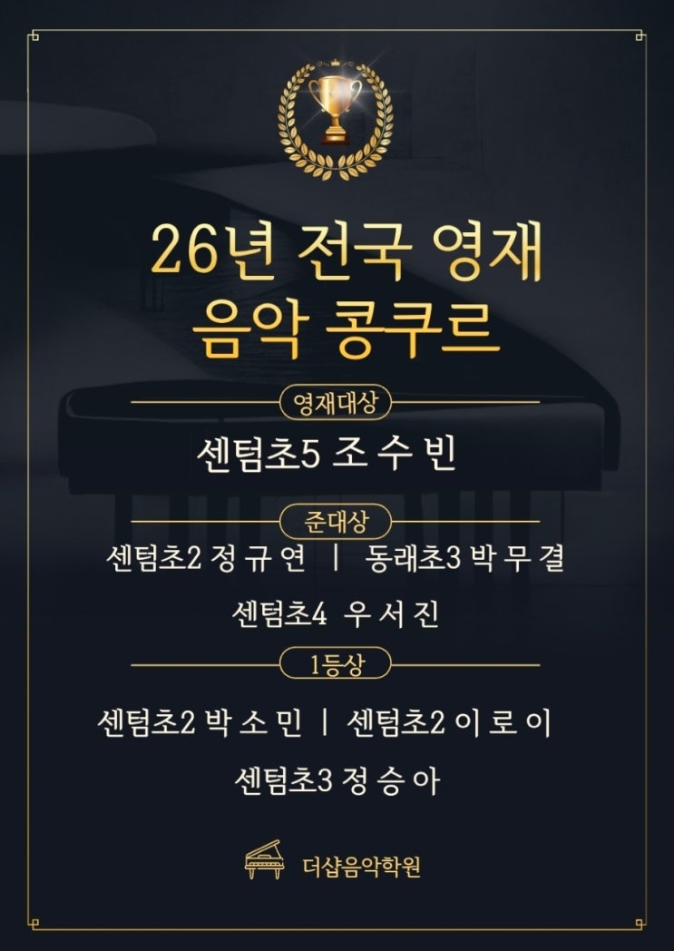 겨울방학기간동안 열심히 연습하고 잘 따라와준 우리 더샾친구들과 선생님들 정말 수고많으셨습니다 역시 우리 부산센텀더샾음악학원!!! 전원입상을 축하합니다 #센텀유아피아노 #센텀음대입시 #재송동음악학원 #부산센텀음악학원 #해운대 #부산예중 #부산예고 #센텀초음악학원 #부산콩쿨 #동래초등학교 ☎️상담문의: 051-741-9595 (모든 상담은 예약제 입니다. 방문 전 꼭 전화로 예약 해주세요.) <img src="https://blogthumb.pstatic.net/MjAyNjAyMDhfMTA5/MDAxNzcwNTMzOTc0Mjkw.J5wNq4sMZHOncsZOmlP2hTsi3PBoZAWj-RrAAh3Xh9Qg.Cl58INazw88j_g18LzE-GUQO2wGgwfZ-vDKA1zxq5y4g.JPEG/900%A3%DFScreenshot%A3%DF20260208%A3%DF144107.jpg?type=s3" />