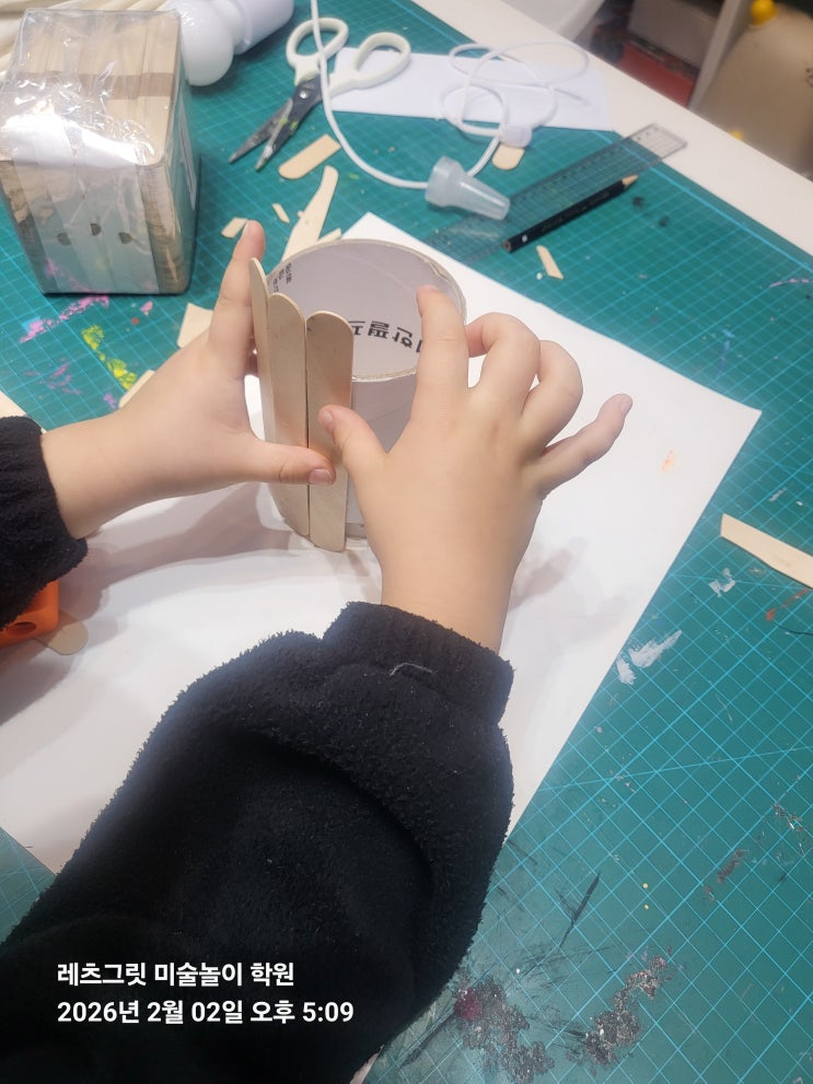 설압자와 휴지심을 활용해 조명을 만들어봅니다. 휴지심은 대형 롤화장지의 휴지심을 사용했습니다. 열본드(글구건)의 사용을 무서워했지만 안전하게 사용하는 방법을 배워가며 조심 조심 사용해봅니다. 원기둥의 외부에 설압자를 나란히 붙힌 다음 마끈으로 둘레를 한번 묶어준 다음 조명을 넣어줍니다. 스스로 만든 전등갓입니다. <img src="https://blogthumb.pstatic.net/MjAyNjAyMDlfMyAg/MDAxNzcwNjA5MDY0Mzkw.ZfFjFgf1wPIsRvJOJYzcfP_FAIDnY2n6tuPj6S1r9BMg.ILY_vnZ_KRW0vc7oAS4ygiriF8hPhQsRp7RwlOmLzYgg.JPEG/KakaoTalk_20260209_124846485_07.jpg?type=s3" />