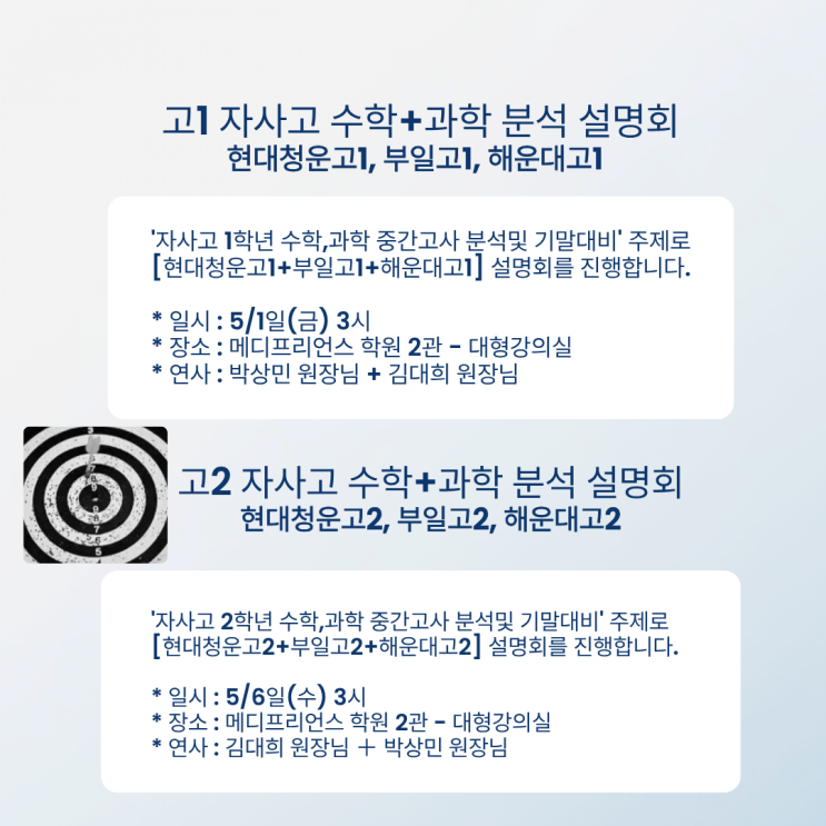 > 중간고사를 마친후 [ 자사고 수학+ 과학 분석설명회와 기말대비 ] 라는 주제로 설명회를 진행합니다 >학년별로 다르게 진행되오니 네이버폼으로 예약해주시기 바랍니다 https://form.naver.com/response/wEc1df0nlqoXOif_Fi https://form.naver.com/response/oGqsjii3qj7_MSLcUI <img src="https://blogthumb.pstatic.net/MjAyNjA0MjRfMjkg/MDAxNzc3MDEzMDI0NTY0.krc690uaIxqawLQt6RDYBxNazLySr5Kj14C4Tk1IDQkg.JfH5FIQVN0Qde-AOs3l94mECuBL6pfBdPS5WBeRMLtMg.PNG/%C1%A6%B8%F1%C0%BB_%C0%D4%B7%C2%C7%D8%C1%D6%BC%BC%BF%E4._%2813%29.png?type=s3" />